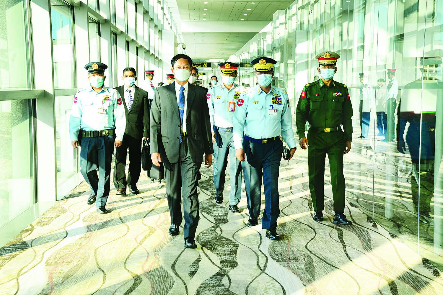 ကာကွယ်ရေးဦးစီးချုပ်(လေ) ဦးဆောင်သော ကိုယ်စားလှယ်အဖွဲ့အား တပ်မတော်အရာရှိကြီးများက လေဆိပ်၌ကြိုဆိုနှုတ်ဆက်ခဲ့ကြကြောင်း သတင်းရရှိသည်။