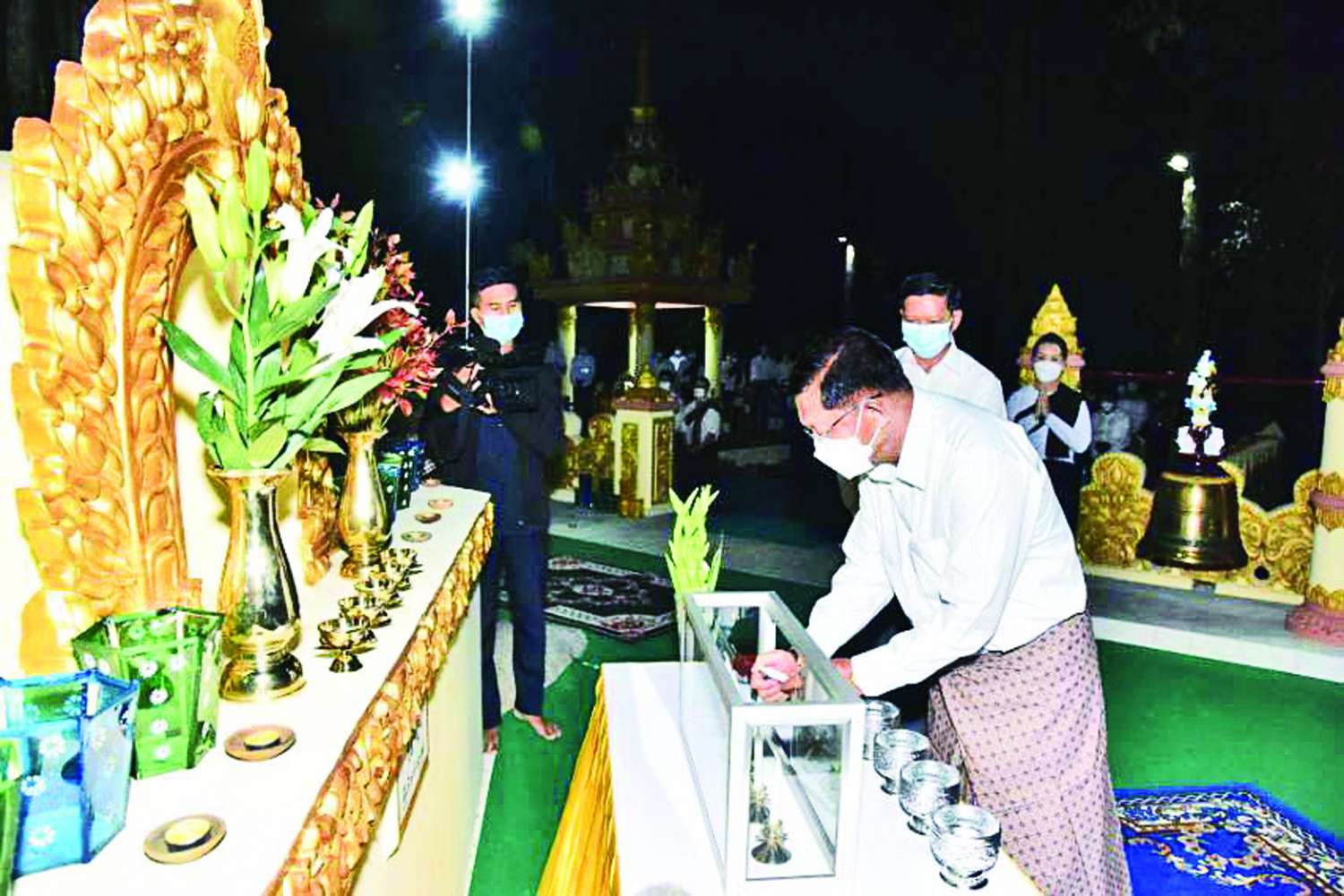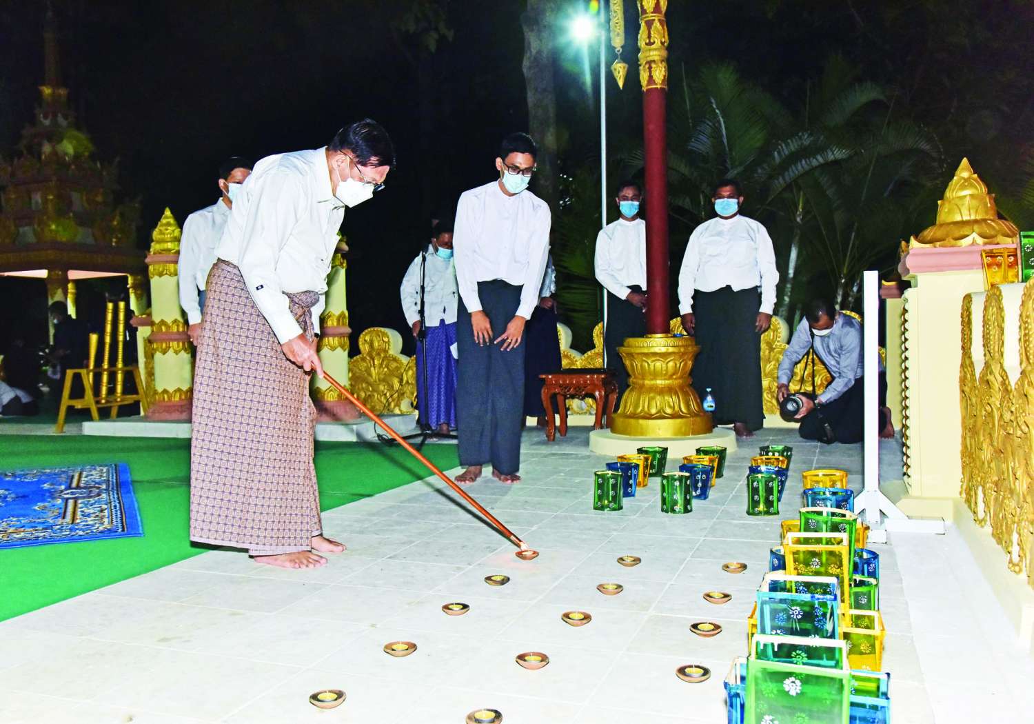 ထိုသို့ မြန်မာ့ယဉ်ကျေးမှုပွဲတော်ကို ထိန်းသိမ်းဆင်နွဲလျက်ရှိကြရာ နေပြည်တော် ကောင်စီနယ်မြေ၊ ဇေယျာသီရိမြို့နယ်အတွင်းရှိ ရွှေဘုန်းပွင့်စေတီတော်မြတ်ကြီးအား ယနေ့ညပိုင်းတွင် နိုင်ငံတော်စီမံအုပ်ချုပ်ရေးကောင်စီဥက္ကဋ္ဌ တပ်မတော်ကာကွယ်ရေး ဦးစီးချုပ် ဗိုလ်ချုပ်မှူးကြီး မင်းအောင်လှိုင်၊ နိုင်ငံတော်စီမံအုပ်ချုပ်ရေးကောင်စီ ဒုတိယဥက္ကဋ္ဌ ဒုတိယတပ်မတော်ကာကွယ်ရေးဦးစီးချုပ် ကာကွယ်ရေးဦးစီးချုပ်(ကြည်း) ဒုတိယ ဗိုလ်ချုပ်မှူးကြီး စိုးဝင်းနှင့် ဇနီး ဒေါ်သန်းသန်းနွယ်၊ ကာကွယ်ရေးဦးစီးချုပ်ရုံးမှ တပ်မတော်အရာရှိကြီးများနှင့် ဇနီးများက ဆီမီးများ၊ ရောင်စုံမီးအလှများဖြင့် ထွန်းညှိ ပူဇော် ခြင်း၊ ပန်း၊ ရေချမ်း ကပ်လှူပူဇော်ခြင်း၊ ဆီမီး(၁၀၀၀) ထွန်းညှိပူဇော်ခြင်းများပြု လုပ်ခဲ့ကြပြီး တန်ဆောင်တိုင်မီးထွန်းပွဲတော်ကို ပျော်ရွှင်ကြည်နူးစွာ ဆင်နွှဲခဲ့ကြသည်။ အလားတူ တန်ဆောင်တိုင်ပွဲတော်၊ မီးထွန်းပွဲတော် အထိမ်းအမှတ်အဖြစ် ကာကွယ်ရေးဦးစီးချုပ်ရုံး (ကြည်း) ဝန်းအတွင်း၌လည်း လမ်း၊ အဆောက်အဦများ၊ ပန်းအလှ သစ်ပင်များတွင် ရောင်စုံမီးအလှများဖြင့် မီးထွန်းပွဲတော်ကို သာယာလှပစွာ ပြုလုပ် ထားရှိရာ မီးထွန်းပွဲတော်သို့ ကာကွယ်ရေးဦးစီးချုပ်ရုံး (ကြည်း၊ ရေ၊ လေ) မိသားစုများက စိတ်နှလုံးအေးချမ်းစွာဖြင့် ပျော်ရွှင်ကြည်နူးစွာ ဆင်နွဲခဲ့ကြသည်။