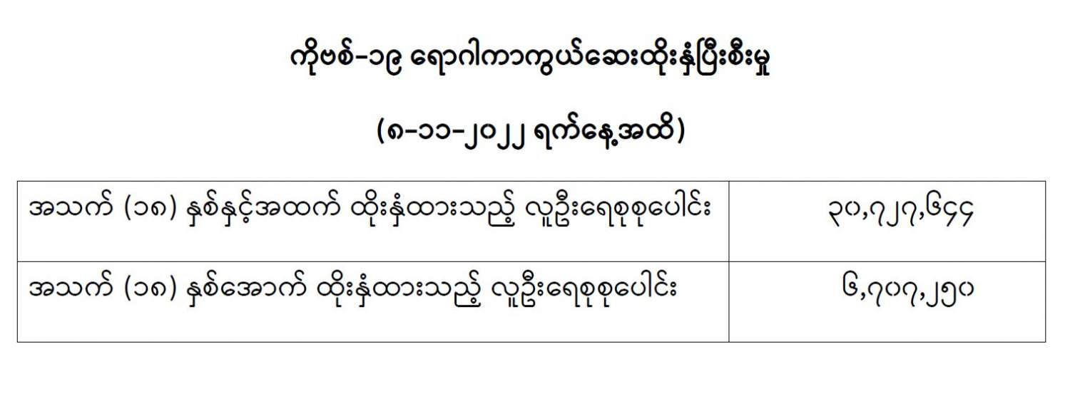 COVID-19 ရောဂါ ကာကွယ်ထိန်းချုပ်ရေးအတွက် တိုင်းဒေသကြီး/ ပြည်နယ်များတွင် COVID-19 ရောဂါကာကွယ်ဆေးကို ဦးတည်အုပ်စုများသတ်မှတ်၍ ထိုးနှံပေးလျက်ရှိရာ (၈-၁၁-၂၀၂၂) ရက်နေ့အထိ အသက် (၁၈) နှစ်နှင့်အထက် လူဦးရေစုစုပေါင်း (၃၀,၇၂၇,၆၄၄) ဦးနှင့် အသက် (၁၈) နှစ် အောက် လူဦးရေစုစုပေါင်း (၆,၇၀၇,၂၅၀) ဦးတို့အား ထိုးနှံထားရှိပြီး ဖြစ်ပါသည်။