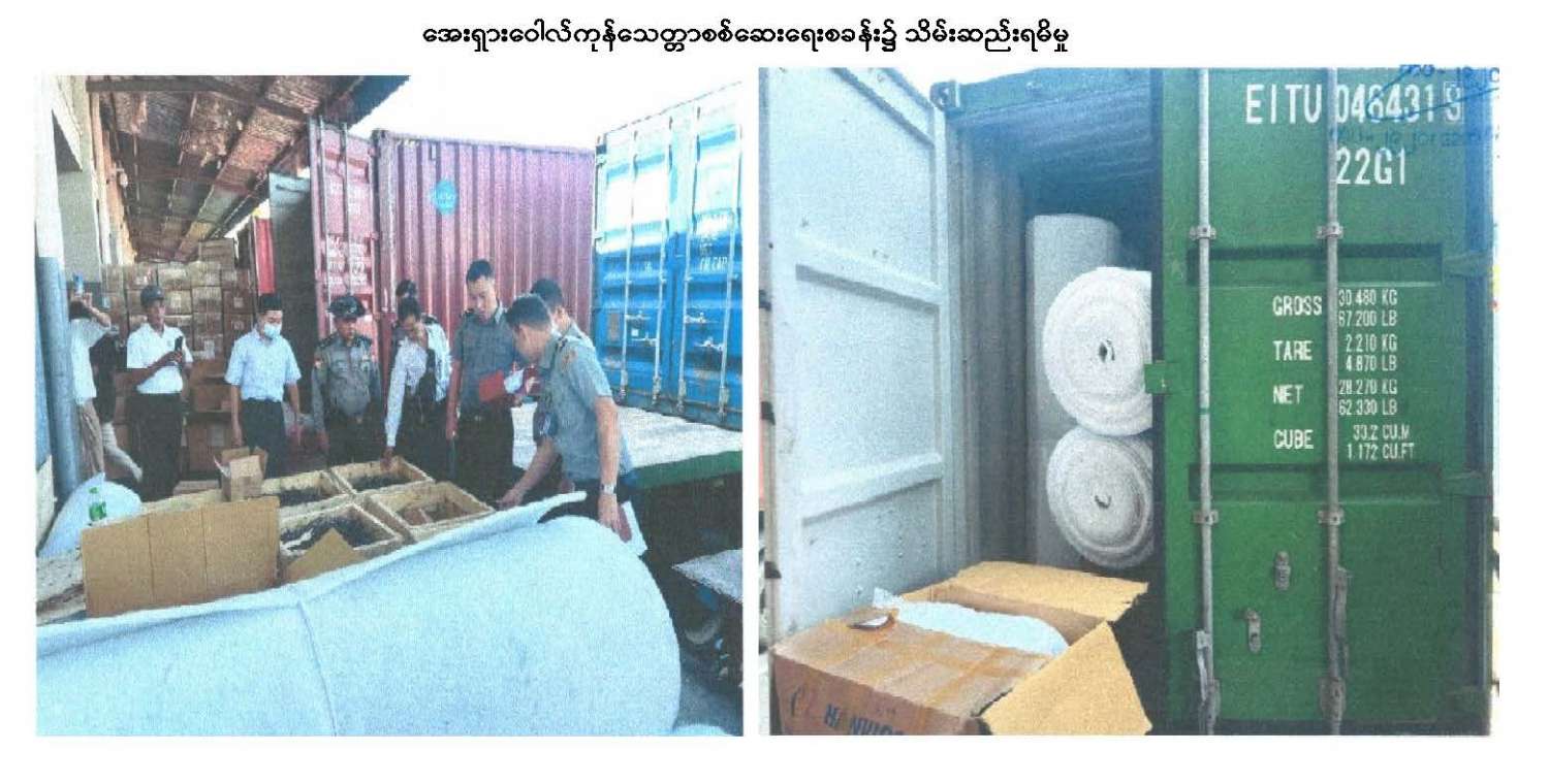 အလားတူ ရန်ကုန်အပြည်ပြည်ဆိုင်ရာ ဆိပ်ကမ်းများ၏ တရားမဝင်ကုန်သွယ်မှုတိုက်ဖျက်ရေး အထူးအဖွဲ့ဦးဆောင်သော ပူးပေါင်းစစ်ဆေးရေးအဖွဲ့က စစ်ဆေးမှုများဆောင်ရွက်ခဲ့ရာ အေးရှားဝေါလ် ကုန်သေတ္တာစစ်ဆေးရေးစခန်း၌ ကုန်သေတ္တာ(၁)လုံးအတွင်းမှ သွင်းကုန်ကြေညာလွှာ (ID)တွင် ကြေညာ ထားခြင်းမရှိသည့် လူသုံးကုန်ပစ္စည်းများ (ခန့်မှန်းတန်ဖိုးငွေကျပ် ၁,၁၅၅,၀၀၀)ကို သိမ်းဆည်းရမိခဲ့ပြီး အကောက်ခွန်လုပ်ထုံးလုပ်နည်းနှင့်အညီ အရေးယူဆောင်ရွက်လျက်ရှိသည်။