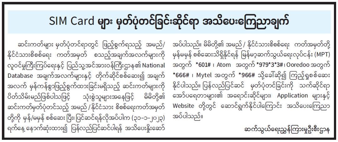 SIM Card များ မှတ်ပုံတင်ခြင်းဆိုင်ရာ အသိပေးကြေညာချက် 11/12/2022 SIM Card များ မှတ်ပုံတင်ခြင်းဆိုင်ရာ အသိပေးကြေညာချက်