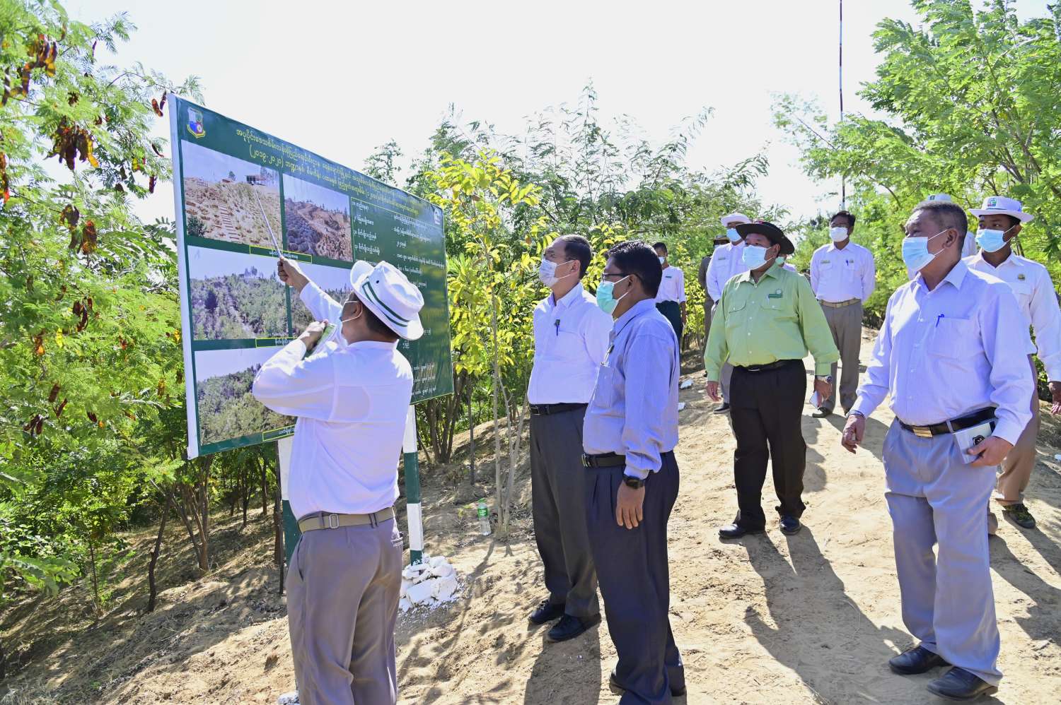 ဆက်လက်၍ ပြည်ထောင်စုဝန်ကြီးသည် မကွေးမြို့နယ် ဒေါင်းနေ တိုးချဲ့ကြိုးပြင် ကာကွယ်တောအတွင်း တည်ထောင်စိုက်ပျိုးထားသော ၁/၂၀၂၀ ကျေးရွာထင်းစိုက်ခင်း ယူကလစ် ဧက ၂၀ ရှင်သန်အောင်မြင်မှုနှင့် ဒေါင်းနေအမြဲတမ်းပျိုးဥယျာဉ်အတွင်း ယူကလစ်၊ ရှား၊ ဒဟက်၊ ကုက္ကိုနှင့် ဖျောက်ဆိပ်အပါအဝင် အပူပိုင်းသစ်မျိုး ပျိုးပင် ၁၂၀,၀၀၀ ကျော် ပျိုးထောင်ထားရှိမှုကို ကြည့်ရှုစစ်ဆေးသည်။