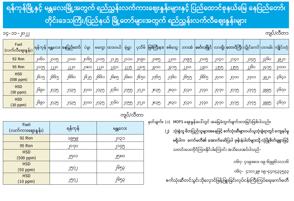 ရန်ကုန်မြို့နှင့် မန္တလေးမြို့အတွက် ရည်ညွှန်းလက်ကားဈေးနှုန်းများနှင့် ပြည်ထောင်စုနယ်မြေ နေပြည်တော် တိုင်းဒေသကြီး/ပြည်နယ် မြို့တောင်များအတွက် ရည်ညွှန်းလက်လီဈေးနှုန်းများ 11/14/2022