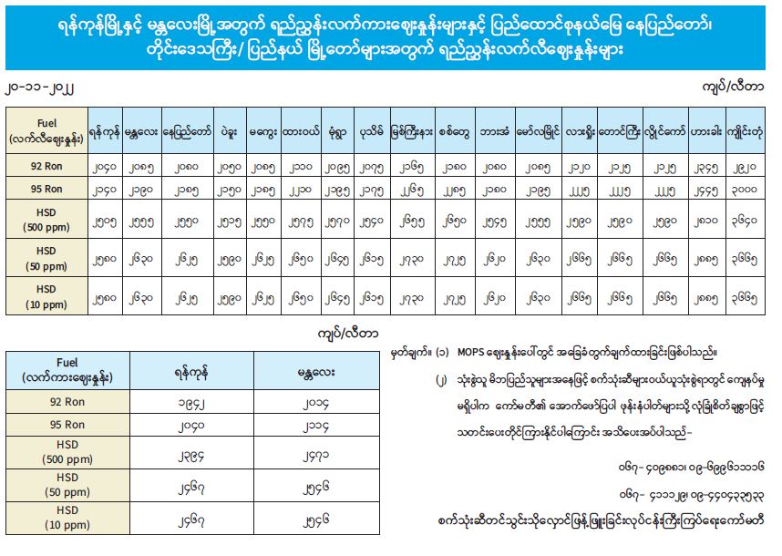 ရန်ကုန်မြို့နှင့် မန္တလေးမြို့အတွက် ရည်ညွှန်းလက်ကားဈေးနှုန်းများနှင့် ပြည်ထောင်စုနယ်မြေ နေပြည်တော်၊ တိုင်းဒေသကြီး/ ပြည်နယ် မြို့တော်များအတွက် ရည်ညွှန်းလက်လီဈေးနှုန်းများ 11/20/2022