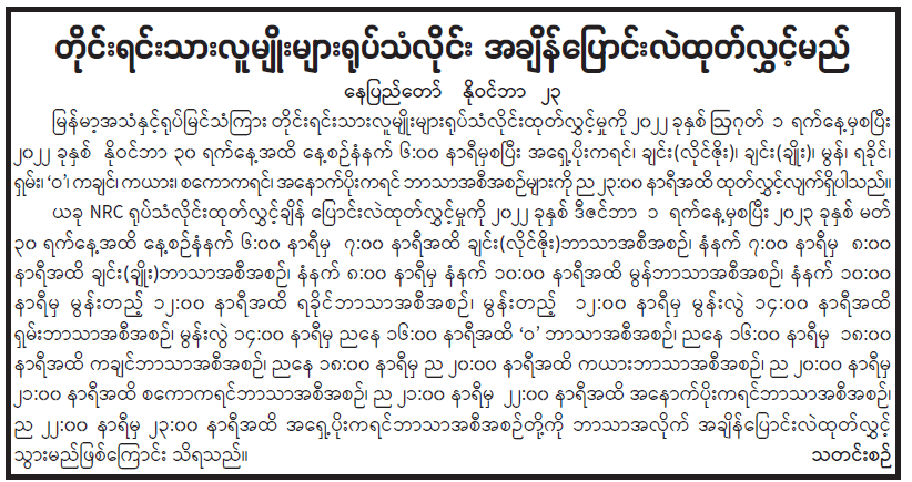 တိုင်းရင်းသားလူမျိုးများရုပ်သံလိုင်း အချိန်ပြောင်းလဲထုတ်လွှင့်မည်