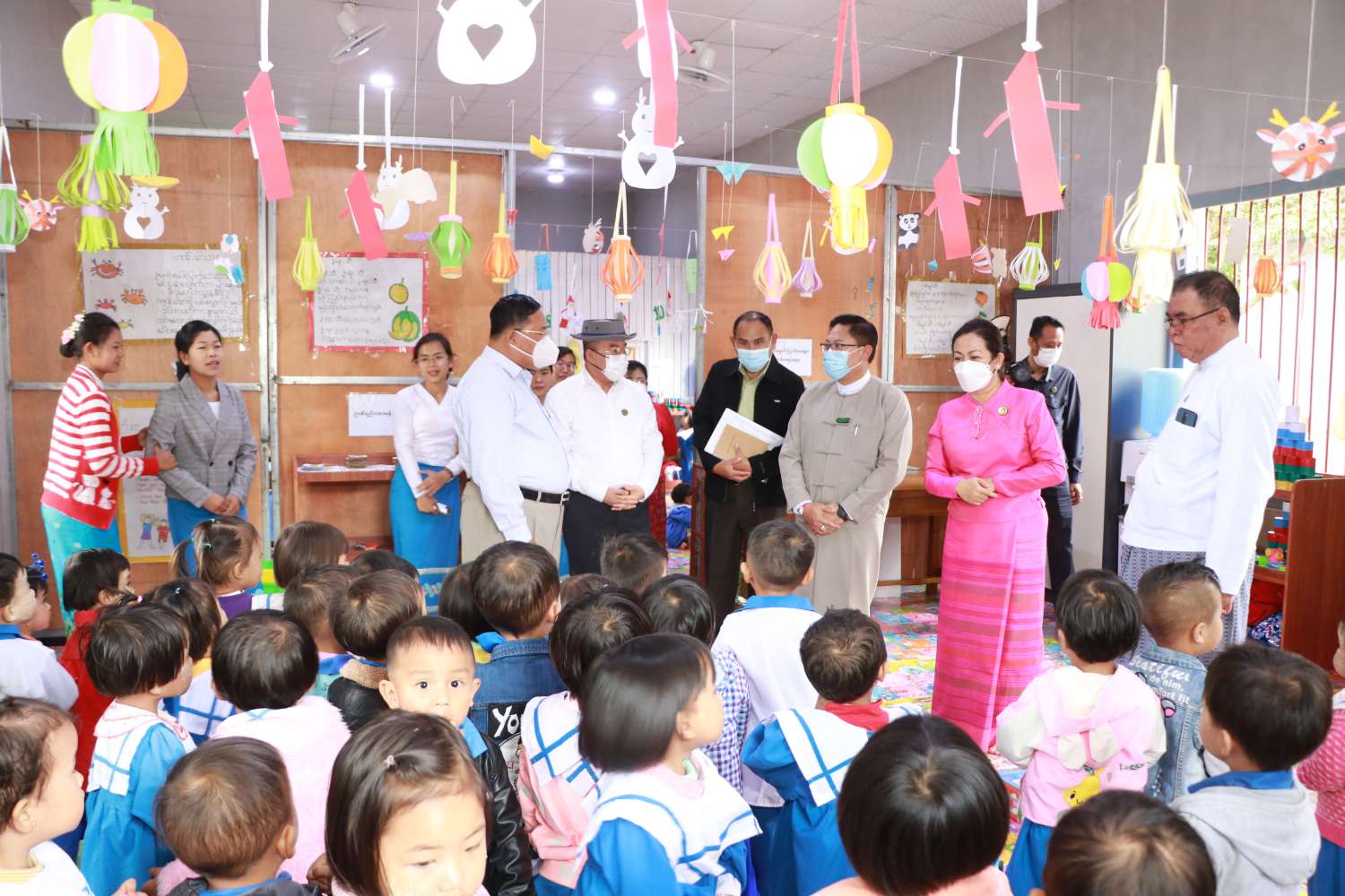 ယင်းနောက် ပြည်ထောင်စုဝန်ကြီး ဒေါက်တာသက်သက်ခိုင်နှင့် အဖွဲ့ဝင်များသည် လူမှုဝန်ထမ်းဦးစီးဌာနမှ ဖွင့်လှစ်ထားသော ပင်းတယမြို့ မူလတန်းကြိုကျောင်းသို့ရောက်ရှိကြရာ ပြည်နယ်လူမှုဝန်ထမ်းဦးစီးမှူးနှင့် တာဝန်ခံကျောင်းအုပ်တို့က ကလေး(၁၀၀)ဦး လက်ခံသင်ကြား ပေးနေမှုအခြေအနေများကို ရှင်းလင်းတင်ပြရာ ပြည်ထောင်စုဝန်ကြီးက ကျောင်းအတွင်း လှည့်လည်ကြည့်ရှုစစ်ဆေးပြီး လိုအပ်သည်များ မှာကြားခဲ့ကြောင်း သိရသည်။