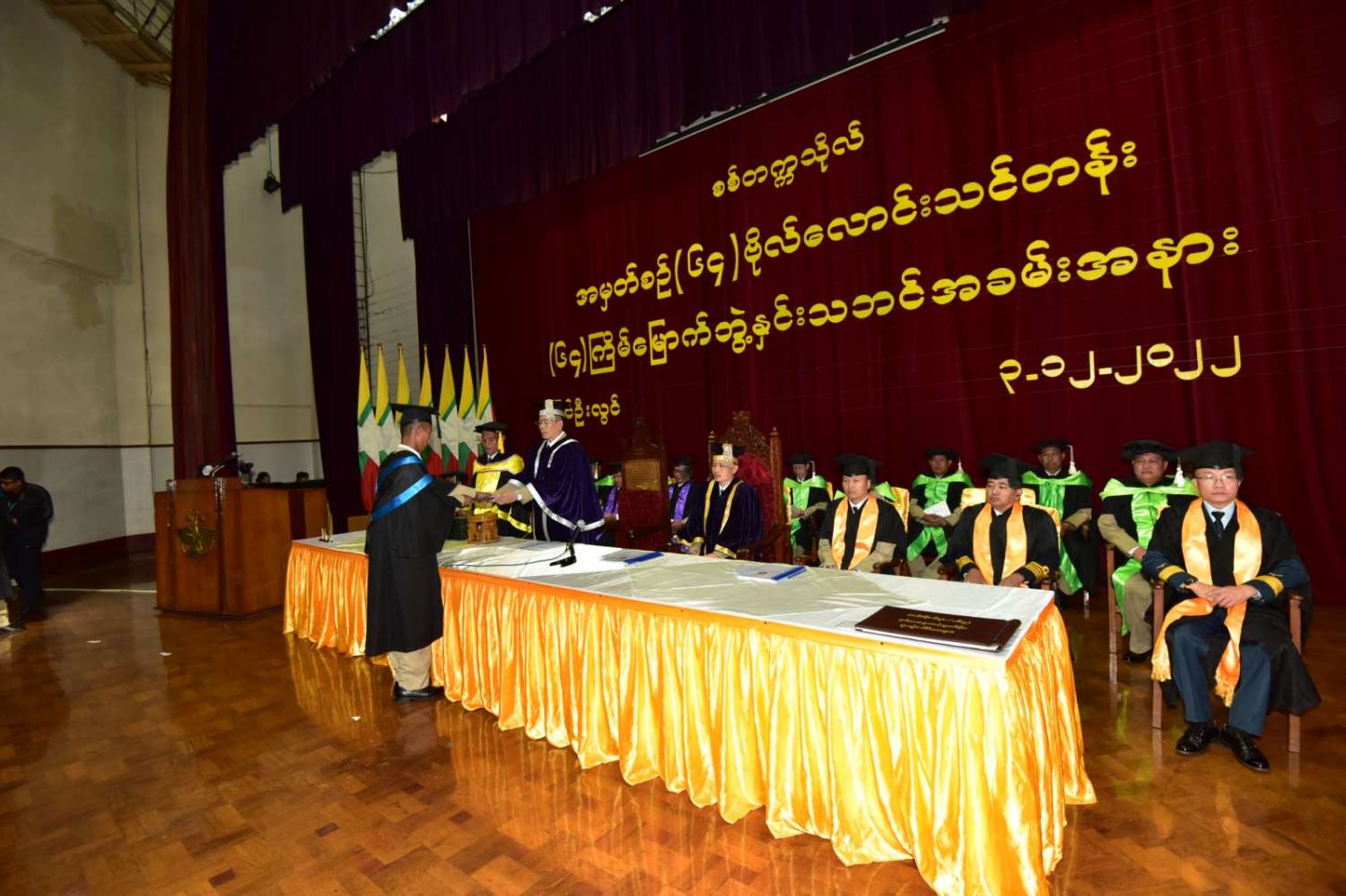 စစ်တက္ကသိုလ်၏ (၆၄) ကြိမ်မြောက် ဘွဲ့နှင်းသဘင်အခမ်းအနားကို ယနေ့နံနက်ပိုင်းတွင် ပြင်ဦးလွင်တပ်နယ်ရှိ စစ်တက္ကသိုလ်ဘွဲ့နှင်းသဘင်ခန်းမ၌ ကျင်းပရာ စစ်တက္ကသိုလ် ကျောင်းအုပ်ကြီး ဗိုလ်ချုပ်ဇော်မင်းလတ်၊ စစ်တက္ကသိုလ် ပါမောက္ခချုပ် ဗိုလ်မှူးချုပ်သိန်းလွင်နှင့် စစ်တက္ကသိုလ်မှ ပညာရေးအဖွဲ့ဝင်များ တက်ရောက်ကြသည်။