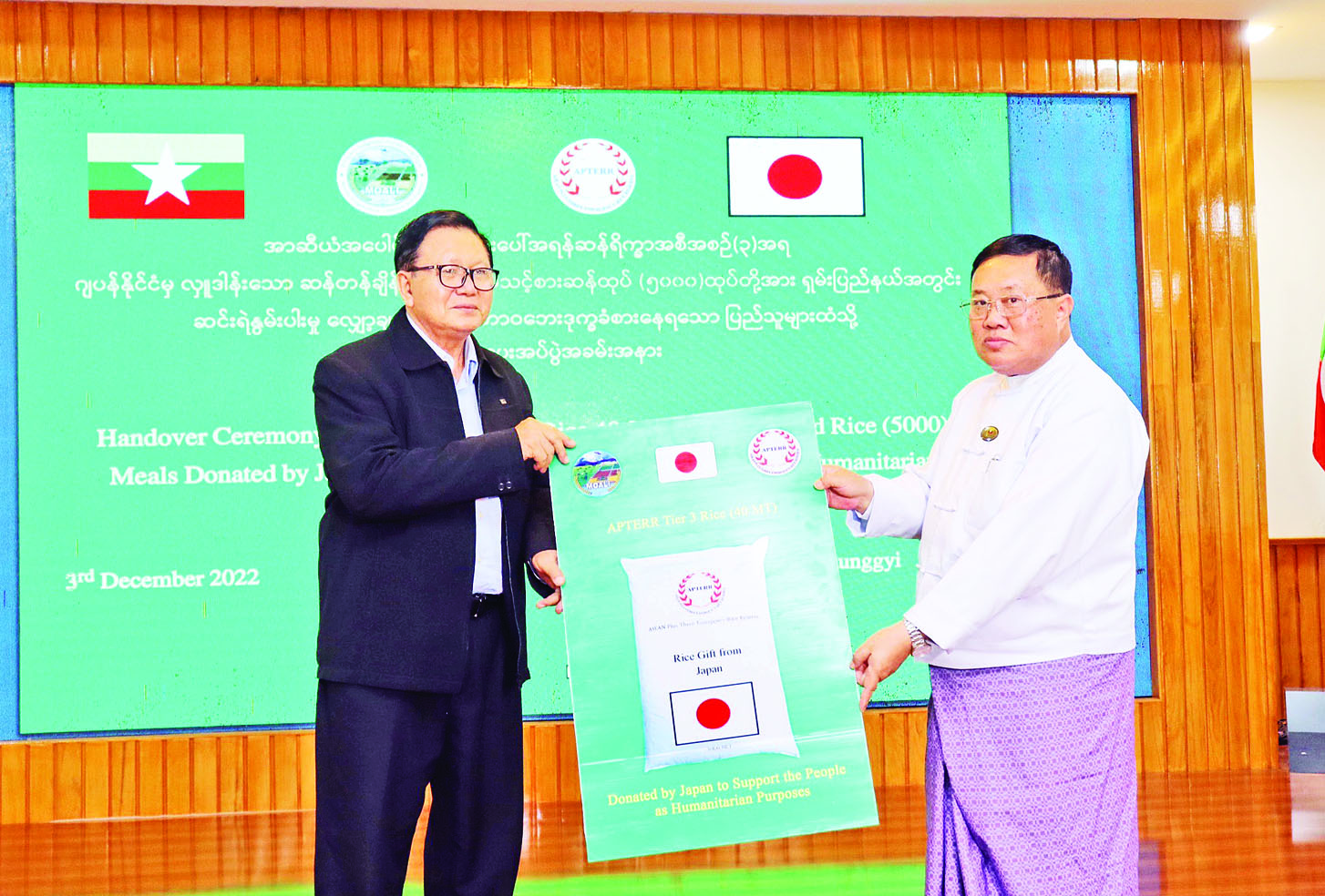 ဆက်လက်၍ ဒုတိယဝန်ကြီးသည် ရှမ်းပြည်နယ်ဝန်ကြီးချုပ် ဒေါက်တာ ကျော်ထွန်းနှင့် အတူ ရှမ်းပြည်နယ် (တောင်ပိုင်း) မွေးမြူရေး လုပ်ငန်းရှင်များ၊ မွေးမြူရေး တောင်သူများနှင့်တွေ့ဆုံကာ ရှမ်းပြည်နယ်၏ အသားကဏ္ဍ ဖွံ့ဖြိုးတိုးတက် ထုတ်လုပ် နိုင်ရေးနှင့် မွေးမြူရေးကဏ္ဍ ရင်းနှီးမြှုပ်နှံမှုတိုးမြှင့်ရေးဆိုင်ရာများကို ညှိနှိုင်းဆွေးနွေး ကြပြီး ရှမ်းပြည်နယ်အတွင်း ဆင်းရဲနွမ်းပါးမှု လျှော့ချရေးနှင့် ဘေးဒုက္ခခံစားနေရသော ဒေသရှိ ပြည်သူများထံ အာဆီယံအပေါင်းသုံး အရေးပေါ်ဆန်ရိက္ခာအစီအစဉ်-၃ အရ ဂျပန်နိုင်ငံမှ လှူဒါန်းသော ဆန်ရိက္ခာများကို ဒုတိယဝန်ကြီးက ပြည်နယ်ဝန်ကြီးချုပ်ထံ လွှဲပြောင်းပေးအပ်သည်။