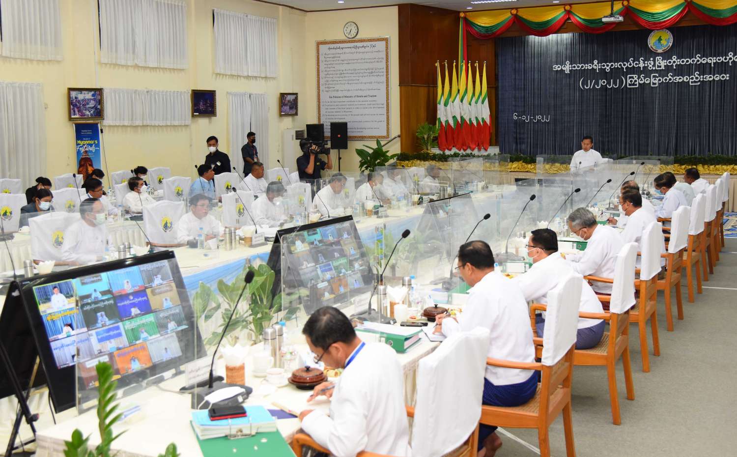 ယခုပွင့်လင်းရာသီမှအစပြုပြီး ခရီးသွားလုပ်ငန်းများ ပုံမှန်လည်ပတ်လာပြီဖြစ်ကြောင်း၊ မြန်မာနိုင်ငံနှင့် ရင်းနှီးပြီးဆက်ဆံရေးကောင်းမွန်သည့် နိုင်ငံများနှင့် အိမ်နီးချင်းနိုင်ငံများကို မိမိတို့၏အဓိကရည်မှန်းဈေးကွက်များအဖြစ် ကနဦးသတ်မှတ်ဖော်ဆောင် သွားရမည်ဖြစ်ကြောင်း၊ မိမိတို့၏ ထူးခြားသည့်ခရီးသွားထုတ်ကုန်နှင့် ဝန်ဆောင်မှုများကိုလည်း Digital Platform များမှတစ်ဆင့် ကမ္ဘာ့ခရီးသွားအဝန်းအဝိုင်းသိရှိနိုင်စေရေး ဆက်လက်မြှင့်တင်ကြိုးပမ်းကြရမည်ဖြစ်ကြောင်း၊ သက်ဆိုင်ရာနိုင်ငံအသီးသီးရှိ မြန်မာနိုင်ငံသံရုံးများမှတစ်ဆင့် မြန်မာ့ခရီးသွားလုပ်ငန်းများကို ကျယ်ကျယ်ပြန့်ပြန့် ဆွဲဆောင်အသိပေးဖိတ်ခေါ်စီမံဆောင်ရွက်ကြရမည်ဖြစ်ကြောင်း၊ စည်းရုံးဖိတ်ခေါ်ဆောင်ရွက်မှုများမှတစ်ဆင့် မိမိတို့နိုင်ငံအတွင်း လာရောက်လည်ပတ်ကြမည့် ပြည်တွင်း/ပြည်ပ ခရီးသွားဧည့်သည်များ ခရီးသွားလာမှုလွယ်ကူချောမွေးစေရေးနှင့် လုံခြုံစိတ်ချစွာခရီးသွားလာနိုင်ရေးသည် အရေးကြီးသည့်အခန်းကဏ္ဍမှပါဝင်နေပြီး ဆင့်ပွားအကျိုးကျေးဇူးများဖြစ်ထွန်းစေမည့် ခရီးသွားလုပ်ငန်းအမျိုးအစားစုံလင်စွာ ဖွံ့ဖြိုး လာစေရန် အပြည်ပြည်ဆိုင်ရာဈေးကွက်တွင် မြန်မာခရီးသွားလုပ်ငန်း ပြန်လည်ဦးမော့လာစေရန် စွန့်ဦးတီထွင်မှုနှင့်အတူ ခရီးသွားထုတ်ကုန်များဖွံ့ဖြိုးလာစေရန်နှင့် ဈေးကွက်များ ပြန်လည်ရှင်သန်အားကောင်းလာစေရေးဆောင်ရွက်ရန် အထူးလိုအပ်ကြောင်း၊ ထိုသို့ဆောင်ရွက်နိုင်ရန် ဗဟိုကော်မတီဝင်ခရီးသွားလုပ်ငန်းနှင့် ဆက်စပ်သည့်ဝန်ကြီးဌာနများ၊ တိုင်းဒေသကြီနှင့် ပြည်နယ်များမှတာဝန်ရှိသူများ၊ မြန်မာနိုင်ငံခရီးသွားလုပ်ငန်းအဖွဲ့ချုပ်နှင့် ညီနောင်အသင်းများက ဝိုင်းဝန်းပူးပေါင်းဆောင်ရွက်ကြသွားရမည်ဖြစ်ကြောင်း။