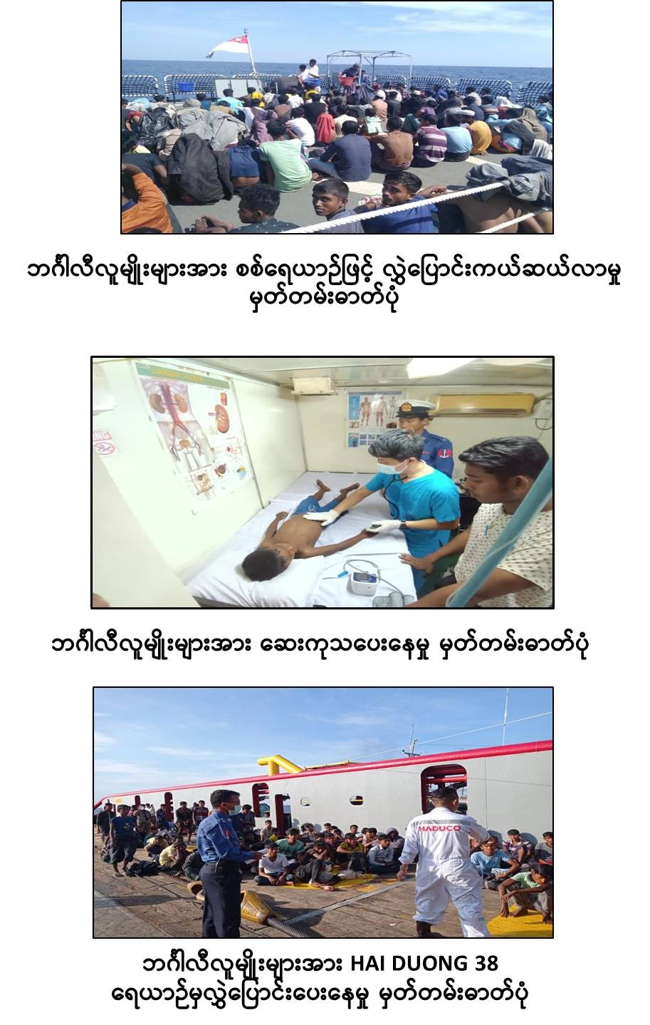 သတင်းရလျင်ရချင်း တပ်မတော်(ရေ)မှ လူသားချင်းစာနာထောက်ထားမှု ဆိုင်ရာလုပ်ငန်းများ ဆောင်ရွက်နိုင်ရန်အတွက် ကော်ဗက်အမျိုးအစားစစ်ရေယာဉ်အား စေလွှတ်ခေါ်ဆောင် စေခဲ့ရာ ည ၁၀ နာရီခန့်တွင် မြိတ်မြို့၏အနောက်တောင်ဘက် ၁၅၅ မိုင်ခန့်အကွာ၌ HAI DUONG 38 ရေယာဉ်နှင့်တွေ့ ဆုံခဲ့ပြီး ဘင်္ဂါလီလူမျိုး လူကြီး ကျား ၈၃ ဦး၊ မ ၄၀ ဦး၊ ကလေး ကျား ၂၃ ဦး၊ မ ၈ ဦး၊ စုစုပေါင်း ၁၅၄ ဦးတို့အား စစ်ရေယာဉ်ပေါ်သို့ လွှဲပြောင်းတင်ဆောင်ခဲ့သည်။ အဆိုပါဘင်္ဂါလီလူမျိုးများသည် ပင်လယ်ပြင်အတွင်း အစာရေစာပြတ်လပ်မှုကြုံတွေ့ခဲ့ရကာ ကျန်းမာရေးချို့တဲ့မှုများ ဖြစ်ပေါ်နေကြောင်း တွေ့ရှိရသဖြင့် ပြန်လည်ခေါ်ဆောင်လာသည့် လမ်းခရီး၌ ဆေးဝါးများကုသမှုများ ဆောင်ရွက်ပေးခြင်း၊ သောက်သုံးရေနှင့် အစားအစာ ကျွေးမွေးခြင်းစသည့် လူသားချင်း စာနာထောက်ထားမှုဆိုင်ရာ ကူညီဖေးမမှုများ ဆောင်ရွက်ပေးခဲ့သည်။