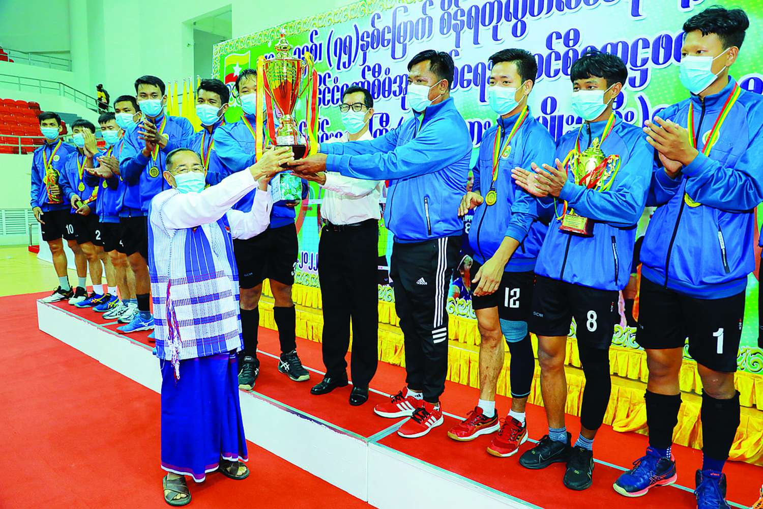 ဆက်လက်ပြီး ဘော်လီဘော(အမျိုးသား)ပြိုင်ပွဲတွင် စတုတ္ထဆုရရှိသော ကရင်ပြည်နယ်အသင်းကို ပညာရေးဝန်ကြီးဌာန ပြည်ထောင်စုဝန်ကြီး ဒေါက်တာ ညွန့်ဖေက ငွေသားဆုငွေကျပ် ၁၀ သိန်းကိုလည်းကောင်း၊ တတိယဆုရရှိသော ပြည်ထောင်စုနယ်မြေ နေပြည်တော်အသင်းကို လူဝင်မှု ကြီးကြပ်ရေးနှင့် ပြည်သူ့အင်အားဝန်ကြီးဌာန ပြည်ထောင်စုဝန်ကြီး ဦးမြင့်ကြိုင်က တစ်ဦးချင်း ဆုတံဆိပ်နှင့် ငွေသားဆုငွေကျပ် ၁၅သိန်းကိုလည်းကောင်း၊ ဒုတိယဆုရရှိသော မန္တလေးတိုင်းဒေသကြီးအသင်းကို နိုင်ငံတော်စီမံအုပ်ချုပ်ရေးကောင်စီအဖွဲ့ဝင် ဦးစိုင်းလုံးဆိုင်က တစ်ဦးချင်း ဆုတံဆိပ်နှင့် ငွေသားဆုငွေကျပ် သိန်း၂၀ကိုလည်းကောင်း၊ ပထမဆုရရှိသော ရန်ကုန်တိုင်းဒေသကြီးအသင်းကို နိုင်ငံတော်စီမံအုပ်ချုပ်ရေးကောင်စီအဖွဲ့ဝင် မန်းငြိမ်းမောင်က တစ်ဦးချင်း ဆုတံဆိပ်၊ ငွေသားဆု ငွေကျပ်သိန်း ၃၀ နှင့် တံခွန်စိုက်ဒိုင်းဆုများကို ပေးအပ်ချီးမြှင့်ပြီး အခမ်းအနားကို ရုပ်သိမ်းလိုက်သည်။