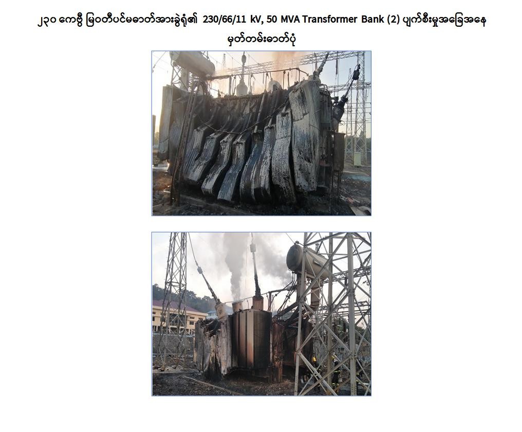 NUG လက်ဝေခံ PDF အမည်ခံအကြမ်းဖက်သမားများသည် အများပြည်သူသို့ ဖြည့်ဆည်းပေးလျက်ရှိသည့် နိုင်ငံတော်၏အခြေခံအဆောက်အအုံများအပေါ် ပျက်စီးစေရန်ရည်ရွယ်ချက်ဖြင့် အကြမ်းဖက်တိုက်ခိုက်မှုများပြုလုပ်ခဲ့ရာ ဓာတ်အားပေးစက်ရုံ၊ ခွဲရုံ၊ ရုံးနှင့် ဝန်ထမ်းအိမ်ရာများသို့ ဝင်ရောက်ဖောက်ခွဲပစ်ခတ်ဖျက်ဆီးမှု အကြိမ်ပေါင်း (၂၁၀) ကြိမ် ပစ်ခတ်ဖျက်ဆီး ဖောက်ခွဲခဲ့သော်လည်း လျှပ်စစ်စွမ်းအားဝန်ကြီးဌာနသည် ပြည်သူများလိုအပ်လျက်ရှိသည့် လျှပ်စစ်ဓာတ်အားကို အမြန်ဆုံးပြန်လည်ရရှိနိုင်ရေးအတွက် သက်ဆိုင်ရာနယ်မြေများရှိ လုံခြုံရေးတပ်ဖွဲ့ဝင်များနှင့်ပူးပေါင်းကာ ပြုပြင်ဆောင်ရွက်မှုများကို ဆောင်ရွက်လျက်ရှိသည်။