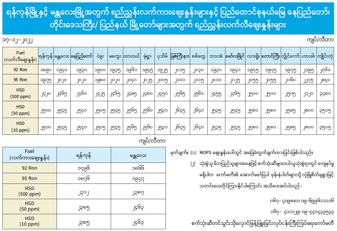 ရန်ကုန်မြို့နှင့် မန္တလေးမြို့အတွက် ရည်ညွှန်းလက်ကားဈေးနှုန်းများနှင့် ပြည်ထောင်စုနယ်မြေ နေပြည်တော်၊ တိုင်းဒေသကြီး/ ပြည်နယ် မြို့တော်များအတွက် ရည်ညွှန်းလက်လီဈေးနှုန်းများ 12/17/2022