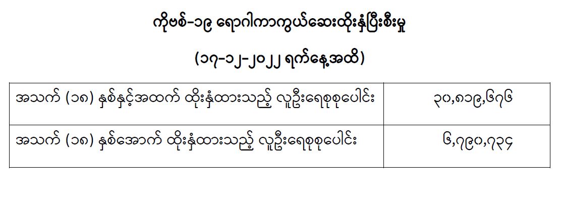 COVID-19 ရောဂါ ကာကွယ်ထိန်းချုပ်ရေးအတွက် တိုင်းဒေသကြီး/ပြည်နယ်များတွင် COVID-19 ရောဂါကာကွယ်ဆေးကို ဦးတည်အုပ်စုများသတ်မှတ်၍ ထိုးနှံပေးလျက်ရှိရာ (၁၇-၁၂-၂၀၂၂) ရက်နေ့အထိ အသက်(၁၈)နှစ်နှင့်အထက် လူဦးရေစုစုပေါင်း (၃၀,၈၁၉,၆၇၆) ဦးနှင့် အသက် (၁၈)နှစ်အောက်လူဦးရေစုစုပေါင်း (၆,၇၉၀,၇၃၄)ဦးတို့အား ထိုးနှံထားရှိပြီးဖြစ်ပါသည်။