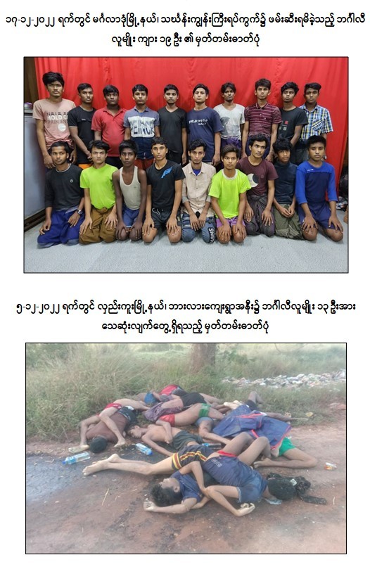 ဖြစ်စဉ်များတွင် ဘင်္ဂါလီလူမျိုး ၂၅၅ ဦးအား တရားမဝင်သယ်ဆောင် ထိန်းသိမ်းထားမှုတွင် ပူးပေါင်းပါဝင်ပတ်သက်ခဲ့သည့် တရားခံအမျိုးသား ၁၂ ဦးတို့အား ဘင်္ဂါလီလူမျိုးများ တရားမဝင်သယ်ယူပို့ဆောင်ရာတွင် အသုံးပြုခဲ့သည့် ဆီဘောက်ဆာယာဉ်တစ်စီး၊ Toyota Vanguard မော်တော်ယာဉ်တစ်စီး၊ Toyota Crown မော်တော်ယာဉ်တစ်စီး၊ Hyundai Starex မော်တော်ယာဉ်တစ်စီး၊ Toyota Probox မော်တော်ယာဉ် ၂ စီး၊ စုစုပေါင်းမော်တော်ယာဉ် မျိုးစုံ ၆ စီးတို့နှင့်အတူ ဖော်ထုတ်ဖမ်းဆီးရမိခဲ့ပြီး ၎င်းတရားမဝင် ဝင်ရောက်လာသည့် ဘင်္ဂါလီလူမျိုးများနှင့် တရားမဝင်သယ်ဆောင်ထိန်းသိမ်းထားရှိသူ ဖမ်းဆီးရမိတရားခံများအား ဥပဒေနှင့်အညီ ထိရောက်စွာ အရေးယူနိုင်ရေး ဆောင်ရွက်လျက်ရှိကြောင်းနှင့် ဖမ်းဆီးရန်ကျန် ဆက်စပ်တရားခံ များအား ဖော်ထုတ်ဖမ်းဆီးရမိနိုင်ရေး ဆက်လက်ဆောင်ရွက်လျက်ရှိကြောင်း သတင်းထုတ်ပြန် အပ်ပါသည်။