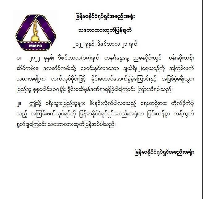 မြန်မာနိုင်ငံရုပ်ရှင်အစည်းအရုံး သဘောထားထုတ်ပြန်ချက်