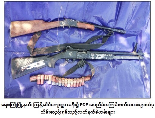 ထိုသို့လုပ်ဆောင်လျက်ရှိရာ မကွေးတိုင်းဒေသကြီး၊ ရေစကြိုမြို့နယ်အတွင်း လုံခြုံရေးဆောင်ရွက်နေသည့် တပ်ဖွဲ့ဝင်များသည် အကြမ်းဖက်မှုကိုမလိုလားသည့် ဒေသခံပြည်သူများ၏ သတင်းပေးပို့ချက်အရ ကြန့်ဆိပ်ကျေးရွာ၏ မြောက်ဘက် မီတာ ၃၀၀ ခန့်အကွာ၌ စောင့်ဆိုင်းနေစဉ် ယနေ့နံနက် ၁၁ နာရီ ၅၀ မိနစ်ခန့်တွင် တောင်ကြားကျေးရွာဘက်မှ ကြန့်ဆိပ်ကျေးရွာဘက်သို့ မောင်းနှင်လာသည့် Mishubishi အမျိုးအစား လိုင်စင်မဲ့မော်တော်ယာဉ်ပေါ်၌ လက်နက်များ ကိုင်ဆောင်ထားသည့် PDF အမည်ခံအကြမ်းဖက်သမားများအား တွေ့ရှိရသဖြင့် ပစ်ခတ်ဖမ်းဆီးခဲ့ရာ အကြမ်းဖက်သမားအမျိုးသား ၃ ဦးအား ၁၂ ဗို့သေနတ် ၁ လက်၊ ၎င်းကျည် ၁၄ တောင့်၊ လက်လုပ်သေနတ် ၁ လက်၊ လက်လုပ်မိုင်း ၄ လုံး၊ လိုင်စင်မဲ့မော်တော်ယာဉ် ၁ စီးတို့နှင့်အတူ အသေပစ်ခတ် ဖမ်းဆီးရမိခဲ့သည်။