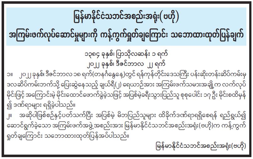 မြန်မာနိုင်ငံသဘင်အစည်းအရုံး(ဗဟို) အကြမ်းဖက်လုပ်ဆောင်မှုများကို ကန့်ကွက်ရှုတ်ချကြောင်း သဘောထားထုတ်ပြန်ချက် 12/23/2022 မြန်မာနိုင်ငံသဘင်အစည်းအရုံး(ဗဟို) အကြမ်းဖက်လုပ်ဆောင်မှုများကို ကန့်ကွက်ရှုတ်ချကြောင်း သဘောထားထုတ်ပြန်ချက်