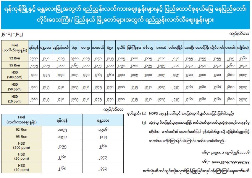 ရန်ကုန်မြို့နှင့် မန္တလေးမြို့အတွက် ရည်ညွှန်းလက်ကားဈေးနှုန်းများနှင့် ပြည်ထောင်စုနယ်မြေ နေပြည်တော်၊ တိုင်းဒေသကြီး/ ပြည်နယ် မြို့တော်များအတွက် ရည်ညွှန်းလက်လီဈေးနှုန်းများ 12/24/2022
