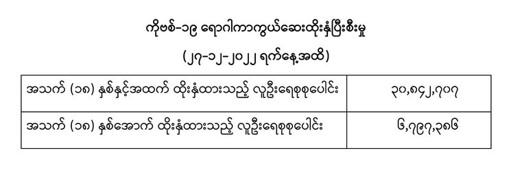 COVID-19 ရောဂါ ကာကွယ်ထိန်းချုပ်ရေးအတွက် တိုင်းဒေသကြီး/ပြည်နယ်များတွင် COVID-19 ရောဂါကာကွယ်ဆေးကို ဦးတည်အုပ်စုများသတ်မှတ်၍ ထိုးနှံပေးလျက်ရှိရာ (၂၇-၁၂-၂၀၂၂) ရက်နေ့အထိ အသက် (၁၈) နှစ်နှင့်အထက် လူဦးရေစုစုပေါင်း (30,842,707) ဦး နှင့် အသက် (၁၈) နှစ်အောက် လူဦးရေစုစုပေါင်း (6,797,386) ဦး တို့အား ထိုးနှံထားရှိပြီး ဖြစ်ပါသည်။