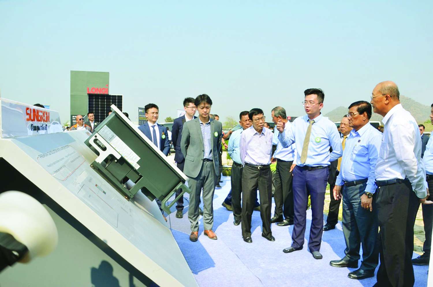ယင်းနောက် နိုင်ငံတော်စီမံအုပ်ချုပ်ရေး ကောင်စီအဖွဲ့ဝင်များ၊ ပြည်ထောင်စုဝန်ကြီးများ၊ တိုင်းဒေသကြီးဝန်ကြီးချုပ်နှင့် တာဝန်ရှိသူများသည် တောင်တော်ကွင်း ၂၀ မဂ္ဂါဝပ် နေရောင်ခြည်စွမ်းအင်သုံး လျှပ်စစ်ဓာတ်အားပေးစက်ရုံအတွင်း နေရောင်ခြည်စွမ်းအင်မှ လျှပ်စစ်ဓာတ်အားများ ထုတ်လုပ်ပြီး နိုင်ငံတော်ဓာတ်အားစနစ်သို့ ချိတ်ဆက်၍ ပို့လွှတ်ဖြန့်ဖြူးပေးနေမှုတို့ကို လှည့််လည်ကြည့်ရှုကြသည်။