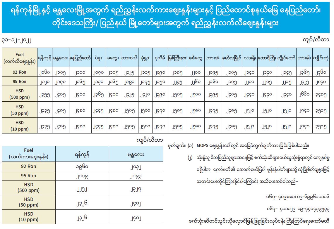 ရန်ကုန်မြို့နှင့် မန္တလေးမြို့အတွက် ရည်ညွှန်းလက်ကားဈေးနှုန်းများနှင့် ပြည်ထောင်စုနယ်မြေ နေပြည်တော်၊ တိုင်းဒေသကြီး/ ပြည်နယ် မြို့တော်များအတွက် ရည်ညွှန်းလက်လီဈေးနှုန်းများ 12/31/2022