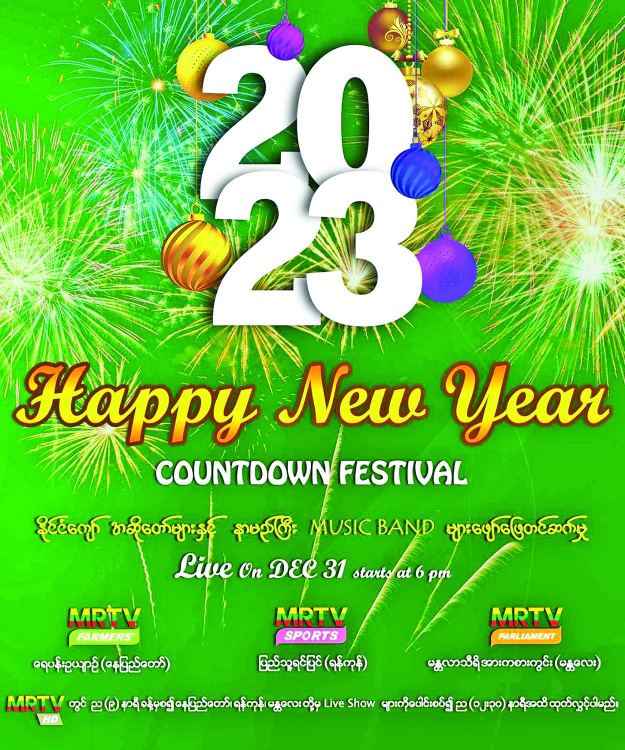 ထိုကဲ့သို့ နေပြည်တော် ရေပန်းဥယျာဉ်၌ ကျင်းပမည့် နှစ်သစ်ကိုကြိုဆိုသည့် ပျော်ပွဲရွှင်ပွဲ အစီအစဉ်တွင် Unplugged တီးဝိုင်းများဖြင့် နိုင်ငံကျော် အဆိုတော်များဖြစ်သည့် မြန်မာပြည်သိန်းတန်၊ D ဖြိုး၊ ဂျေမိုင်းမိုင်တို့၏ ဖျော်ဖြေမှုများကို MRTV ၏ Farmer’s Channel တွင်လည်းကောင်း၊ ရန်ကုန်မြို့ ပြည်သူ့ရင်ပြင်၌ ကျင်းပမည့် ပျော်ပွဲရွှင်ပွဲအစီအစဉ် တွင် GREAT NINE MUSIC BAND ၏ တီးခတ်မှုနှင့်အတူ နိုင်ငံကျော်အဆိုတော်များဖြစ်သည့် အကယ်ဒမီ များရှင် ရန်အောင်၊ အကယ်ဒမီများရှင် ရဲအောင်၊ အကယ်ဒမီများရှင် မေသန်းနု၊ စတီရီယိုတေးသံရှင် ဂျက်မြသောင်း၊ ပြည်မိုး၊ စိန်လင်း၊ ရုပ်ရှင်သရုပ်ဆောင် ဘုန်းလျှံ၊ လှမျိုးသဉ္ဇာနွယ်၊ ပွင့်နဒီမောင်၊ သဉ္ဇာမြင့်မိုရ်၊ စိုးသီဟ၊ ရုပ်ရှင်သရုပ်ဆောင်/တေးသံရှင် ဝေလျှံ၊ ဂျင်းနီ၊ ဆူဇီ၊ တူယှဉ်နွှဲပျော်ဂီတပွဲတော်မှ စိုးထက်အောင်၊ ထွန်းပပအောင်၊ ပူတူးနှင့် ပြုံးအသင်္ချေ၊ ယွန်းသီရိကျော်၊ မျိုးဆက်သစ်တေးသံရှင်များစွာ ပါဝင်တင်ဆက်သွားမည့် ဖျော်ဖြေမှုများကို MRTV ၏ Sports Channel တွင်လည်းကောင်း၊ မန္တလေးမြို့ မန္တလာသီရိအားကစားကွင်း၌ နိုင်ငံကျော်အဆိုတော်များ ပါဝင်တင်ဆက်မည့် ဖျော်ဖြေတင်ဆက်မှုများကို MRTV ၏ Parliament Channel တွင်လည်းကောင်း ဖျော်ဖြေပွဲ စတင်ချိန် ညနေ ၆ နာရီမှ အစီအစဉ်ပြီးစီး သည်အထိ တိုက်ရိုက် Live ထုတ်လွှင့်သွားမည်ဖြစ်ကြောင်း၊ MRTV HD Channel တွင် ည ၈ နာရီ သတင်းများအပြီးမှစတင်၍ အစီအစဉ်ပြီးစီးချိန်အထိ နေပြည်တော်၊ ရန်ကုန်နှင့် မန္တလေးတို့တွင်ကျင်းပသည့် ဂီတဖျော်ဖြေပွဲ Live Show အစီအစဉ်များကို ပေါင်းစပ်၍ ထုတ်လွှင့်သွားမည်ဖြစ်ကြောင်း သိရသည်။