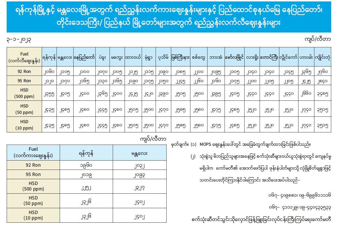 ရန်ကုန်မြို့နှင့် မန္တလေးမြို့အတွက် ရည်ညွှန်းလက်ကားဈေးနှုန်းများနှင့် ပြည်ထောင်စုနယ်မြေ နေပြည်တော်၊ တိုင်းဒေသကြီး/ ပြည်နယ် မြို့တော်များအတွက် ရည်ညွှန်းလက်လီဈေးနှုန်းများ 01/03/2023