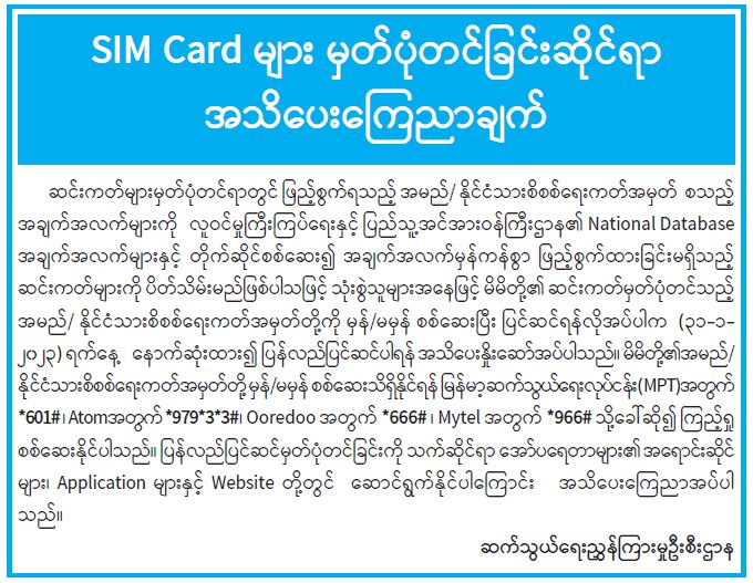 SIM Card များမှတ်ပုံတင်ခြင်းဆိုင်ရာ အသိပေးကြေညာချက်