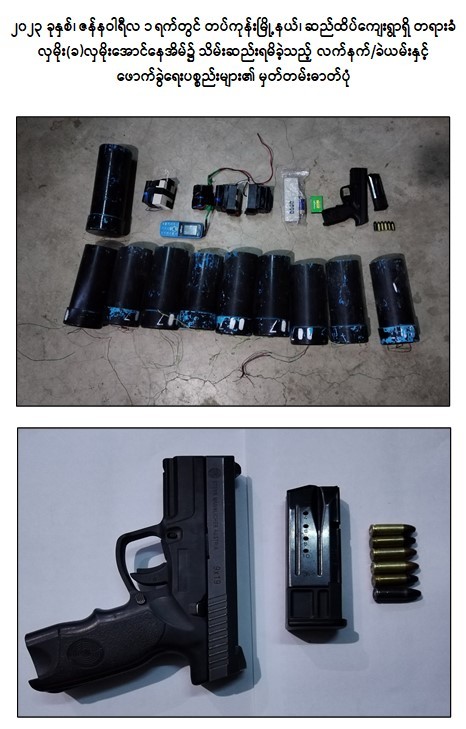 ဖြစ်စဉ်တွင် တရားခံ ကျား ၃ ဦး ပစ္စတို ၁ လက်၊ ၎င်းကျည်အိမ် ၁ ခု၊ ကျည် ၆ တောင့်၊ PVC ပိုက်ဖြင့် ပြုလုပ်ထားသည့် လက်လုပ်မိုင်း ၁၀ လုံး၊ Keypad ဖုန်းဖြင့် ချိတ်ဆက်ဖောက်ခွဲရသည့် ခလုတ် ၃ ခု၊ Keypad ဖုန်း ၁ လုံး၊ ရီမု ၁ ခု၊ ဆက်စပ်ပစ္စည်းများနှင့်အတူ ဖမ်းဆီးရမိခဲ့သည်။