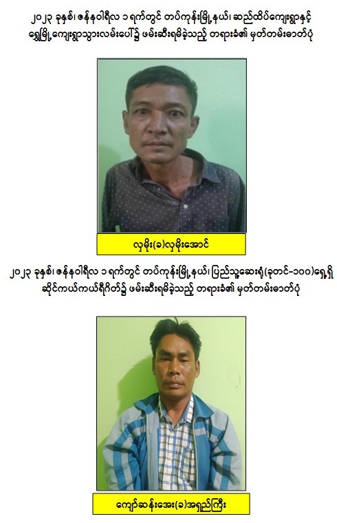 သို့ဖြစ်ပါ၍ ဖမ်းဆီးရမိတရားခံများအား ဥပဒေအရထိရောက်စွာအရေးယူနိုင်ရေး ဆက်လက်ဆောင်ရွက်သွားမည်ဖြစ်ကြောင်း၊ အကြမ်းဖက်မှု ဆောင်ရွက်နေသူများအား ပြည်သူတစ်ရပ်လုံးက ဝိုင်းဝန်းကာကွယ်တိုက်ဖျက်ကြရန်နှင့် ဆက်စပ်တရားခံများအား အမြန်ဆုံးဆက်လက်ဖမ်းဆီးရမိရေးအတွက် ၎င်းတို့ပုန်းခိုရာနေရာများ၊ လှုပ်ရှားသွားလာနေထိုင်မှု သတင်းများရရှိပါက သက်ဆိုင်ရာသို့ လျှို့ဝှက်စွာသတင်းပေး တိုင်ကြားနိုင်ပါကြောင်း၊ သတင်းပေးသူနှင့် ဖမ်းဆီးပေးသူများအား ထိုက်တန်စွာလျှို့ဝှက်၍ ဆုငွေများချီးမြှင့်ပေးလျက်ရှိကြောင်းနှင့် မြို့ရွာများအမြန်ဆုံးအေးချမ်း တည်ငြိမ်ရေးအတွက် ပြည်သူတစ်ရပ်လုံး ပူးပေါင်းပါဝင်ကြိုးပမ်း ဆောင်ရွက်နိုင်ပါရန် မေတ္တာရပ်ခံအပ်ပါကြောင်း အသိပေး သတင်းထုတ်ပြန်အပ်ပါသည်။