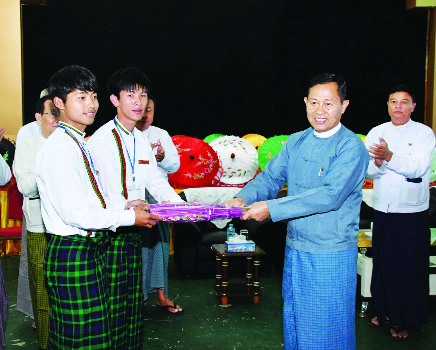 ထို့နောက် နိုင်ငံတော်စီမံအုပ်ချုပ်ရေးကောင်စီ ဒုတိယဥက္ကဋ္ဌ ဒုတိယဝန်ကြီးချုပ်နှင့် ပြည်ထောင်စုဝန်ကြီးများ ဖြစ်ကြသည့် ဦးမောင်မောင်အုန်း၊ ဦးကိုကိုနှင့် ဦးမင်းသိန်းဇံ၊ နေပြည်တော်ကောင်စီဥက္ကဋ္ဌ ဦးတင်ဦးလွင်၊ ဧရာဝတီတိုင်းဒေသကြီးဝန်ကြီးချုပ် ဦးတင်မောင်ဝင်းနှင့် ဒုတိယဝန်ကြီး ဦးမျိုးလှိုင်တို့က တိုင်းရင်းသားရိုးရာ ယဉ်ကျေးမှုအဖွဲ့များ အား ပုသိမ်ထီးများ အမှတ်တရ လက်ဆောင်ပေးအပ်ကြသည်။