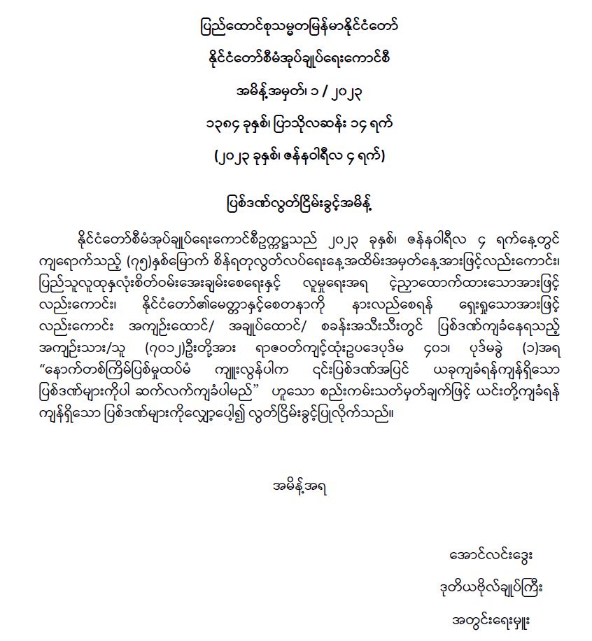 ပြည်ထောင်စုသမ္မတမြန်မာနိုင်ငံတော် နိုင်ငံတော်စီမံအုပ်ချုပ်ရေးကောင်စီ အမိန့်အမှတ်၊ ၁ / ၂၀၂၃ 01/04/2023