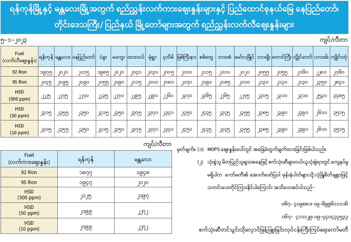 ရန်ကုန်မြို့နှင့် မန္တလေးမြို့အတွက် ရည်ညွှန်းလက်ကားဈေးနှုန်းများနှင့် ပြည်ထောင်စုနယ်မြေ နေပြည်တော်၊ တိုင်းဒေသကြီး/ ပြည်နယ် မြို့တော်များအတွက် ရည်ညွှန်းလက်လီဈေးနှုန်းများ 01/05/2023