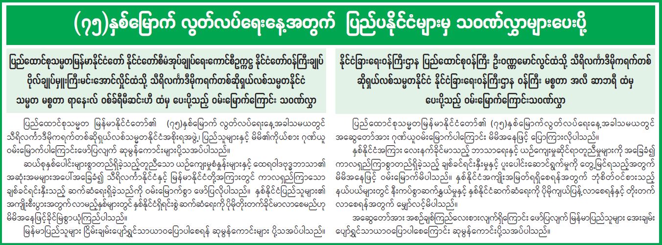 (၇၅)နှစ်မြောက် လွတ်လပ်ရေးနေ့အတွက် ပြည်ပနိုင်ငံများမှ သဝဏ်လွှာများပေးပို့