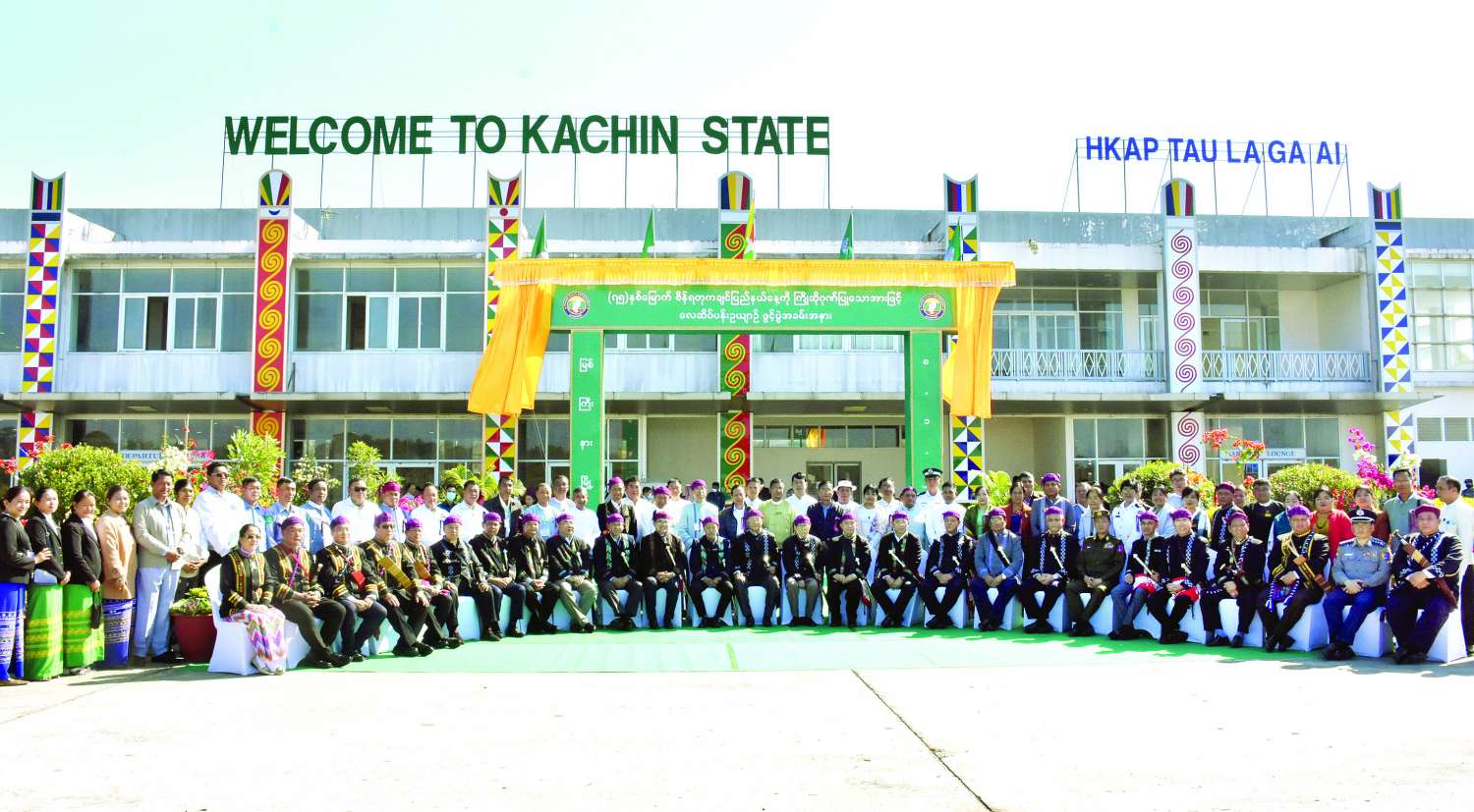 ထို့နောက် နိုင်ငံတော်စီမံအုပ်ချုပ်ရေးကောင်စီအဖွဲ့ဝင်များ၊ ပြည်ထောင်စုဝန်ကြီးများ၊ ပြည်နယ်ဝန်ကြီးချုပ်နှင့် ဒုတိယဝန်ကြီးများသည် (၇၅)နှစ်မြောက် စိန်ရတုကချင်ပြည်နယ်နေ့ကို ကြိုဆိုဂုဏ်ပြုသောအားဖြင့် ဖွင့်လှစ်မည့်လေဆိပ်ဝင်းအတွင်းရှိ လေဆိပ်ပန်းဥယျာဉ်ဖွင့်ပွဲအခမ်းအနားသို့ တက်ရောက်ကြသည်။