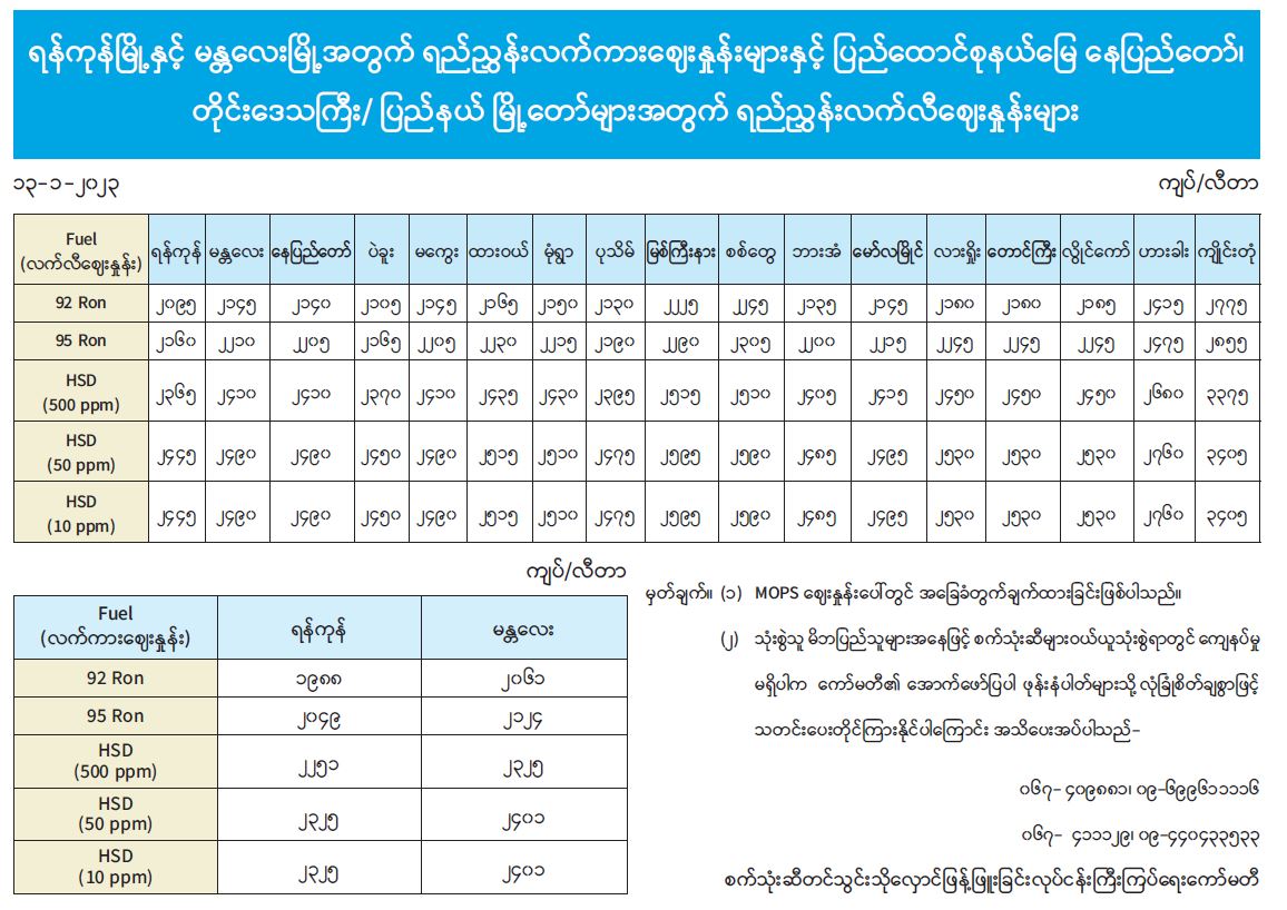 ရန်ကုန်မြို့နှင့် မန္တလေးမြို့အတွက် ရည်ညွှန်းလက်ကားဈေးနှုန်းများနှင့် ပြည်ထောင်စုနယ်မြေ နေပြည်တော်၊ တိုင်းဒေသကြီး/ ပြည်နယ် မြို့တော်များအတွက် ရည်ညွှန်းလက်လီဈေးနှုန်းများ 01/13/2023