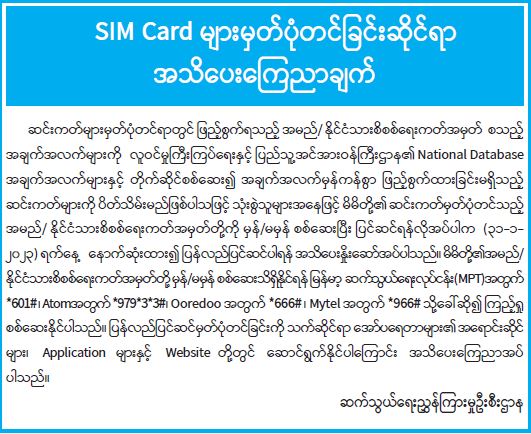 SIM Card များမှတ်ပုံတင်ခြင်းဆိုင်ရာ အသိပေးကြေညာချက်