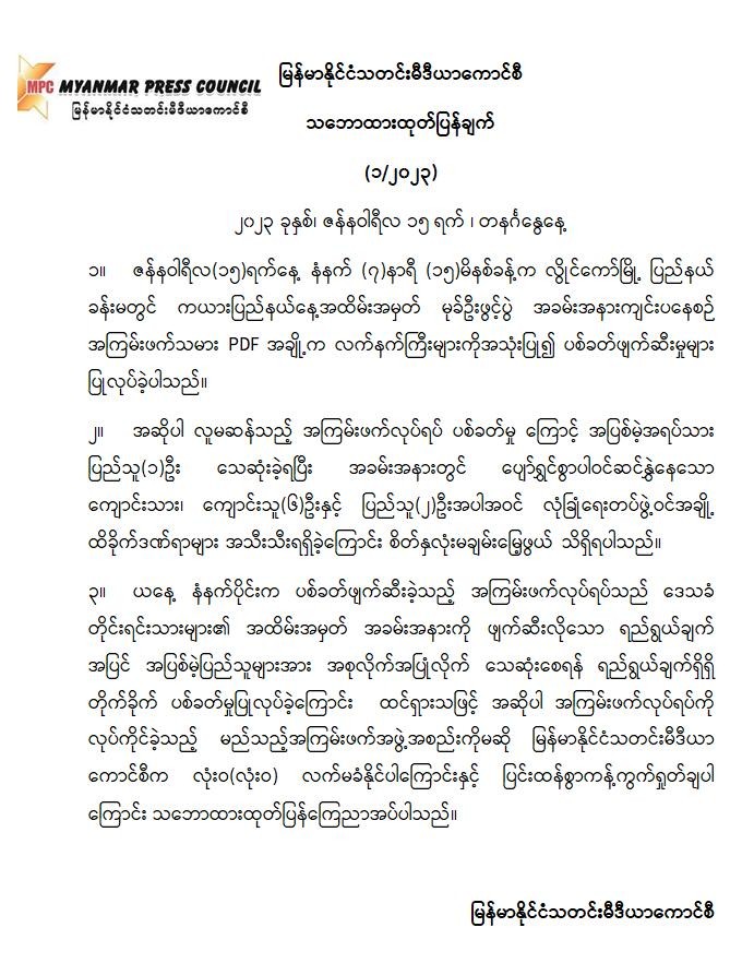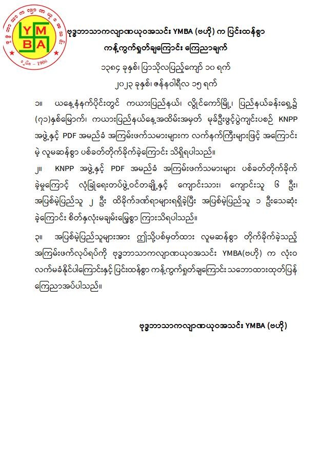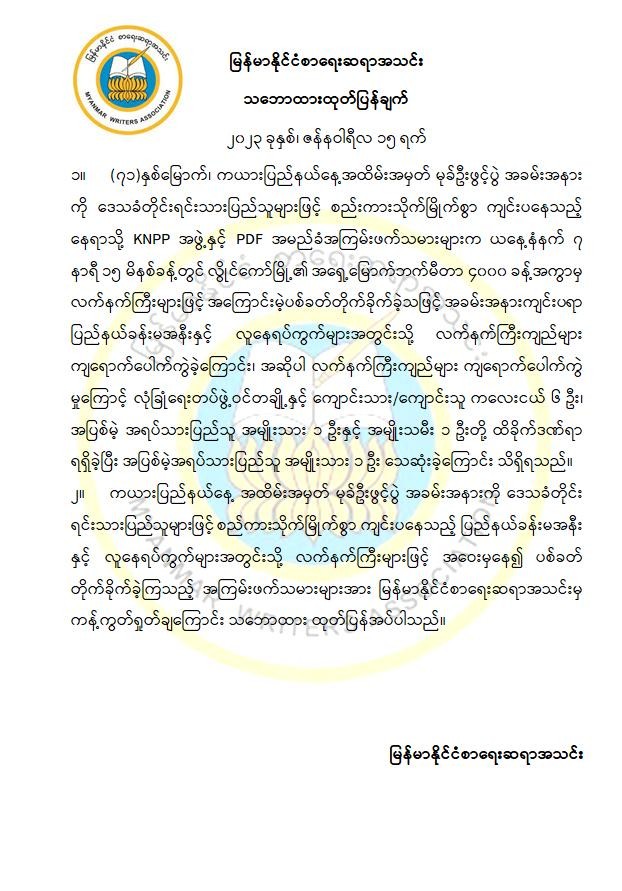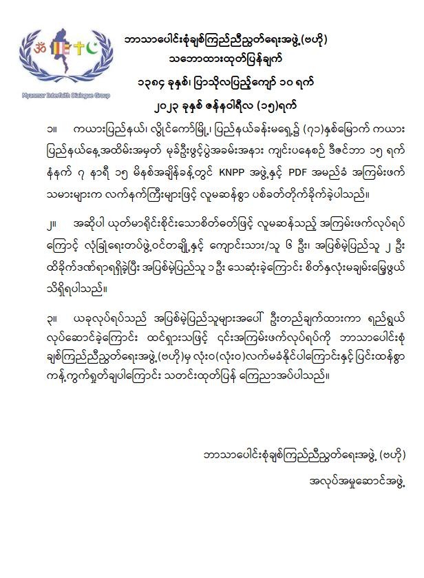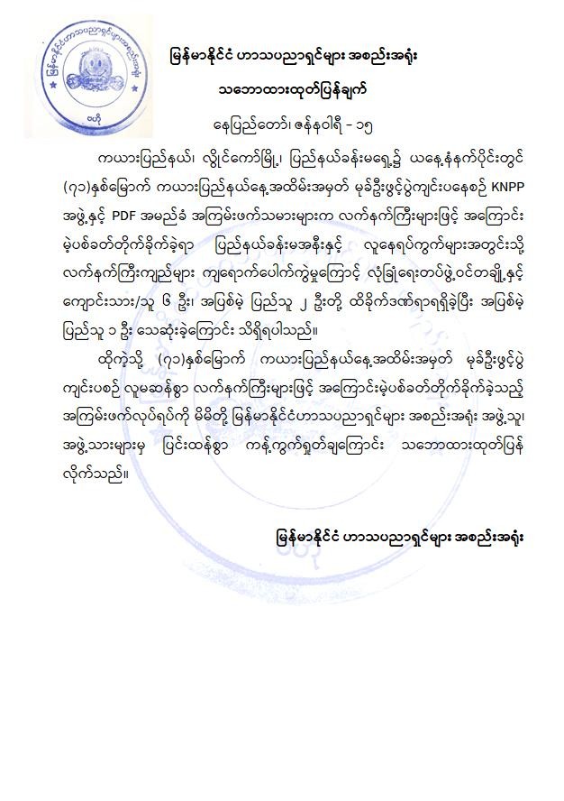 ကယားပြည်နယ်၊ လွိုင်ကော်မြို့၊ ပြည်နယ်ခန်းမရှေ့၌ (၇၁)နှစ်မြောက် ကယားပြည်နယ်နေ့အထိမ်းအမှတ် မုခ်ဦးဖွင့်ပွဲအခမ်းအနားကို ဒေသခံတိုင်းရင်းသား ပြည်သူများဖြင့် စည်ကားသိုက်မြိုက်စွာ ကျင်းပနေစဉ် KNPP အဖွဲ့နှင့် PDF အမည်ခံအကြမ်းဖက် သမားများက နံနက် ၇ နာရီ ၁၅ မိနစ်ခန့်တွင် လွိုင်ကော်မြို့၏ အရှေ့မြောက်ဘက်မီတာ ၄၀၀၀ ခန့်အကွာမှ လက်နက်ကြီးများဖြင့် ယုတ်မာရက်စက်သည့်အကြံဖြင့် လူမဆန်စွာပစ်ခတ် တိုက်ခိုက်သဖြင့် အခမ်းအနားကျင်းပရာ ပြည်နယ်ခန်းမအနီးနှင့် လူနေရပ်ကွက်များအတွင်းသို့ လက်နက်ကြီးကျည်များ ကျရောက်ပေါက်ကွဲခဲ့ကြောင်း၊ အဆိုပါလက်နက်ကြီးကျည်များ ကျရောက်ပေါက်ကွဲမှုကြောင့် လုံခြုံရေးတပ်ဖွဲ့ဝင်တချိုနှင့် ကျောင်းသား/ကျောင်းသူကလေးငယ် ၆ ဦး၊ အပြစ်မဲ့ အရပ်သားပြည်သူ အမျိုးသား ၁ ဦးနှင့် အမျိုးသမီး ၁ ဦးတို့ ထိခိုက်ဒဏ်ရာ ရရှိခဲ့ပြီး အပြစ်မဲ့အရပ်သားပြည်သူ အမျိုးသား ၁ ဦး သေဆုံးခဲ့ကြောင်း သိရှိရသည်။
