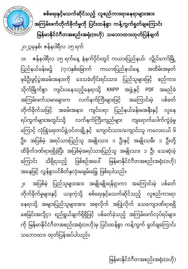 အဆိုပါဖြစ်စဉ်နှင့်ပတ်သက်၍ ဗုဒ္ဓဘာသာကလျာဏယုဝအသင်းYMBA(ဗဟို)၊ ဘာသာပေါင်းစုံ ချစ်ကြည်ညီညွတ်ရေးအဖွဲ့(ဗဟို)၊ မြန်မာနိုင်ငံသတင်းမီဒီယာကောင်စီ၊ မြန်မာနိုင်ငံ စာရေးဆရာအသင်း၊ မြန်မာနိုင်ငံဂီတအစည်းအရုံး(ဗဟို)နှင့် မြန်မာနိုင်ငံ ဟာသပညာရှင်များ အစည်းအရုံးများက လက်မခံနိုင်ပါကြောင်းနှင့် ပြင်းထန်စွာ ကန့်ကွက်ရှုတ်ချပါကြောင်း သဘောထားများ အသီးသီးထုတ်ပြန်ခဲ့ကြကြောင်း သတင်းရရှိသည်။