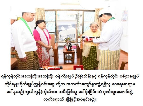 ထိုသို့ ချီးမြှင့်အပ်နှင်းပေးလျက်ရှိရာတွင် ယနေ့တွင်ရန်ကုန်တိုင်းဒေသကြီး ဝန်ကြီးချုပ်ဦးစိုးသိန်း၊ ရန်ကုန်တိုင်းစစ်ဌာနချုပ်တိုင်းမှူး ဗိုလ်ချုပ်ညွန့်ဝင်းဆွေနှင့် တာဝန်ရှိသူများက ဝဏ္ဏကျော်ထင်ဘွဲ့ရရှိသူ ဆောက်လုပ်ရေးဌာန ဒုတိယဝန်ကြီး ဦးကျင်လှိုင်(ကွယ်လွန်)ကိုယ်စား သားဖြစ်သူ ဦးမြင့်ဌေးကိုလည်းကောင်း၊ ဝဏ္ဏကျော်ထင်ဘွဲ့ရရှိသူ အမှတ်(၂)စက်မှုဌာန ဒုတိယဝန်ကြီး ဦးကျော်ဇ(ကွယ်လွန်)ကိုယ်စား သားဖြစ်သူဦးရဲဝင့်ကျော် ကိုလည်းကောင်း၊ ဝဏ္ဏကျော်ထင်ဘွဲ့ရရှိသူ ပြည်ထဲရေးနှင့်သာသနာရေးဝန်ကြီးဌာန ဒုတိယဝန်ကြီး ဦးပေါ်သိမ်း(ကွယ်လွန်) ကိုယ်စားသားဖြစ်သူ ဦးကျော်စိုးကိုလည်းကောင်း၊ သီရိပျံချီဘွဲ့ရရှိသူ ပြည်ထဲရေးနှင့် သာသနာရေးဝန်ကြီးဌာနဝန်ကြီး ဗိုလ်မှူးကြီး ဘိုနီ(ငြိမ်း)(ကွယ်လွန်)ကိုယ်စား သမက်ဖြစ်သူ ဦးစိုးဝင်းကိုလည်းကောင်း၊ အလင်္ကာကျော်စွာဘွဲ့ရရှိသူ အနုပညာရှင် စည်သူဗိုလ်ကလေးတင့်အောင်(ကွယ်လွန်)ကိုယ်စား သမီးဖြစ်သူဒေါ်စိုးစိုးတင့်ကိုလည်းကောင်း၊ စည်သူဘွဲ့ရရှိသူ ကာကွယ်ရေးဦးစီးချုပ်(ရေ) ဗိုလ်မှူးချုပ် သောင်းတင်(ငြိမ်း) (ကွယ်လွန်)ကိုယ်စားသမီးဖြစ်သူ ဒေါ်တင်ကြည်တင်ကိုလည်းကောင်း ဂုဏ်ထူးဆောင်ဘွဲ့များအား ၎င်းတို့၏နေအိမ်များသို့ သွားရောက်၍ လက်ဝယ်အရောက်ချီးမြှင့် အပ်နှင်းခဲ့ကြသည်။