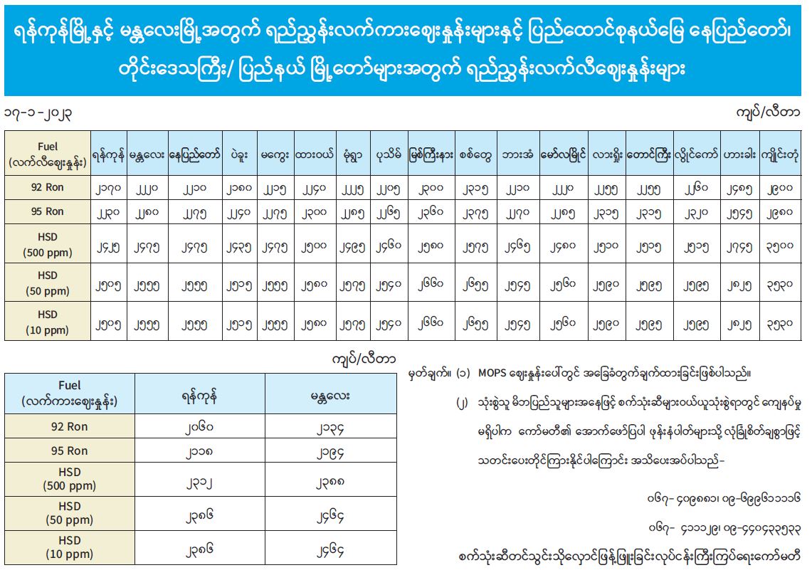 ရန်ကုန်မြို့နှင့် မန္တလေးမြို့အတွက် ရည်ညွှန်းလက်ကားဈေးနှုန်းများနှင့် ပြည်ထောင်စုနယ်မြေ နေပြည်တော်၊ တိုင်းဒေသကြီး/ ပြည်နယ် မြို့တော်များအတွက် ရည်ညွှန်းလက်လီဈေးနှုန်းများ 01/17/2023