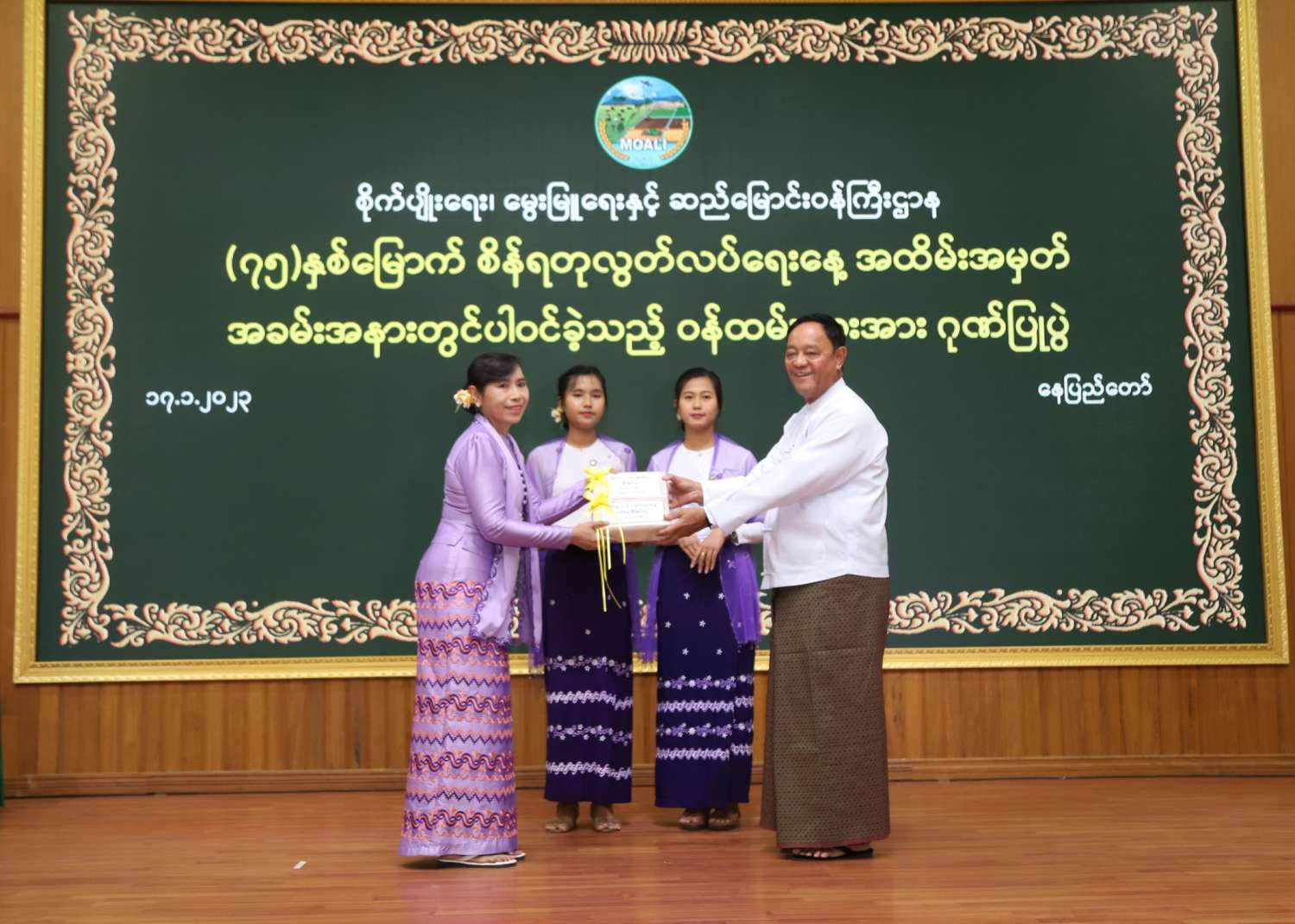 ထို့နောက် ပြည်ထောင်စုဝန်ကြီး ဦးလှမိုးနှင့် ဒုတိယဝန်ကြီး ဒေါက်တာအောင်ကြီးတို့က (၇၅)နှစ်မြောက် စိန်ရတုလွတ်လပ်ရေးနေ့ ဂုဏ်ပြုအခမ်းအနားတွင် စိုက်ပျိုးရေး၊ မွေးမြူရေးနှင့် ဆည်မြောင်းဝန်ကြီးဌာန ကိုယ်စားပြု စစ်ရေးပြတပ်ခွဲ၊ ဂုဏ်ပြုယာဉ်၊ ပြခန်းတို့၌ ပါဝင်ဆောင်ရွက် ခဲ့ကြသောဝန်ထမ်းများနှင့် အားကစားပြိုင်ပွဲဆုရသူများကို ဂုဏ်ပြုမှတ်တမ်းလွှာများနှင့် ဂုဏ်ပြုဆုများချီးမြှင့်ပေးအပ်ရာ ဝန်ထမ်းများကိုယ်စား သက်ဆိုင်ရာအဖွဲ့ခေါင်းဆောင်များက လက်ခံရယူခဲ့ကြသည်။