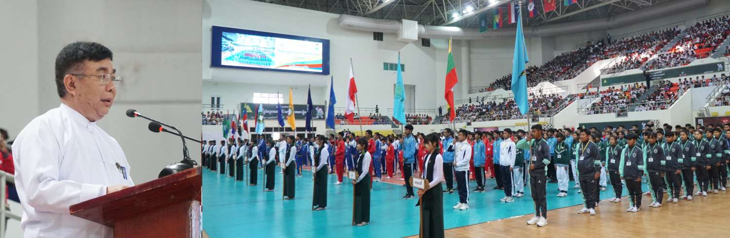 ရှေးဦးစွာ ပညာရေးဝန်ကြီးဌာန ပြည်ထောင်စုဝန်ကြီး ဒေါက်တာညွန့်ဖေက အခြေခံပညာကျောင်းသားအားကစားပွဲတော်တွင် ဘောလုံး(အမျိုးသား/အမျိုးသမီး)၊ ဘော်လီဘော (အမျိုးသား/ အမျိုးသမီး)၊ ပြေးခုန်ပစ် (အမျိုးသား/အမျိုးသမီး)နှင့် ပိုက်ကျော်ခြင်း (အမျိုးသား) အားကစားနည်းများကို ကျင်းပပေးသွားမည်ဖြစ်ပါကြောင်း၊ အားကစားဆိုသည်မှာ “အနိုင်အရှုံးတစ်ခုတည်းကို ယှဉ်ပြိုင်တာမျိုးမဟုတ်ဘဲ ဇွဲရှိမှု၊ သည်းခံမှု၊ ကျွမ်းကျင်မှု၊ စိတ်ဓာတ်ကြံ့ခိုင်မှု၊ စည်းလုံးညီညွတ်မှု၊ စည်းကမ်းဥပဒေကို ရိုသေလေးစားလိုက်နာမှု၊ ယဉ်ကျေးမှု” စသည်တို့ကိုပါ ယှဉ်ပြိုင်ခြင်းဖြစ်ပါကြောင်း၊ နိုင်ငံတကာအားကစားပြိုင်ပွဲများတွင် အောင်မြင်မှုရရှိခြင်းသည် နိုင်ငံတော်၏စည်းလုံးညီညွတ်မှု၊ ဂုဏ်သိက္ခာနှင့် မျိုးချစ်စိတ်တို့ကို ဖော်ဆောင်နိုင်ခြင်းဖြစ်ပါကြောင်း၊ ယခုကျင်းပသည့် အခြေခံပညာကျောင်းသားအားကစားပွဲတော်ကြီးတွင် ပါဝင်ယှဉ်ပြိုင်ကြမည့် အားကစားမောင်မယ်များအနေဖြင့် နိုင်ငံတော်၏ဂုဏ်သိက္ခာကိုဖော်ဆောင်နိုင်သော နိုင်ငံ့လက်ရွေးစင်အားကစားသမားများဖြစ်လာအောင် ကြိုးစားကြရန်ကိုလည်း မှာကြားလိုပါကြောင်း။