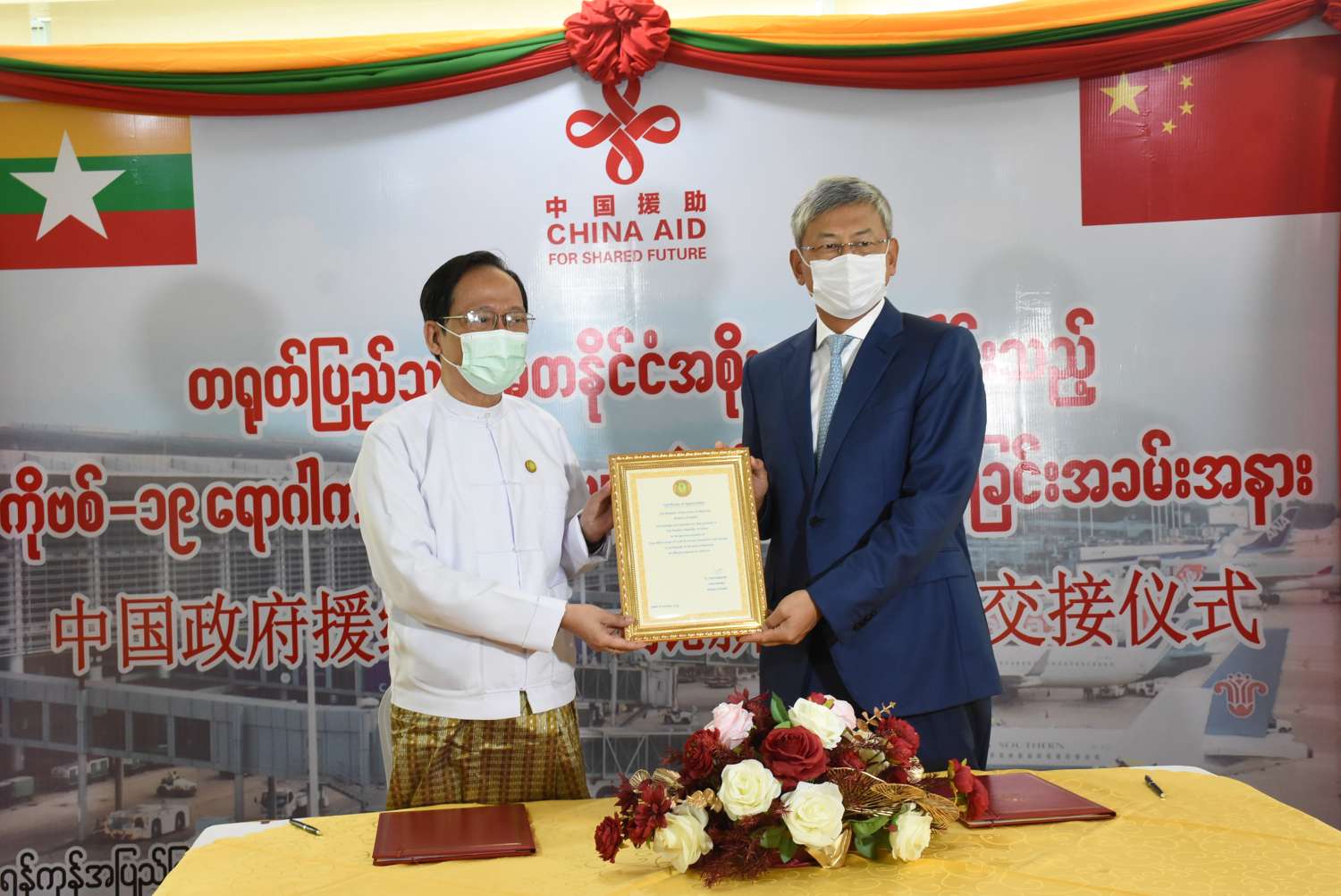 ထို့နောက် ကာကွယ်ဆေးများ လွှဲပြောင်းလက်ခံသည့်မှတ်တမ်းအား နှစ်နိုင်ငံအပြန်အလှန် လက်မှတ်ရေးထိုး၍ ပြည်ထောင်စုဝန်ကြီးက ကျေးဇူးတင်ဂုဏ်ပြုလွှာကို ပြန်လည်ပေးအပ်ခဲ့ပြီး လှူဒါန်းထားသည့် ကာကွယ်ဆေးများကို လှည့်လည်ကြည့်ရှု စစ်ဆေးကြကာ မှတ်တမ်းတင်ဓာတ်ပုံရိုက်ကာ အခမ်းအနားကို ရုတ်သိမ်းလိုက်သည်။