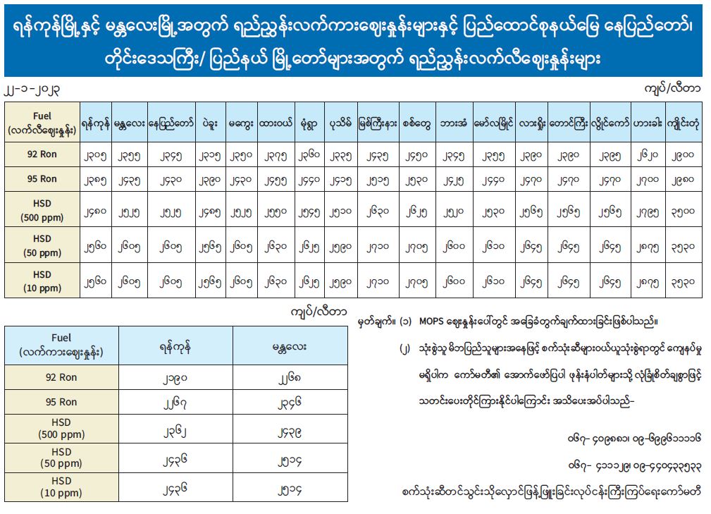 ရန်ကုန်မြို့နှင့် မန္တလေးမြို့အတွက် ရည်ညွှန်းလက်ကားဈေးနှုန်းများနှင့် ပြည်ထောင်စုနယ်မြေ နေပြည်တော်၊ တိုင်းဒေသကြီး/ ပြည်နယ် မြို့တော်များအတွက် ရည်ညွှန်းလက်လီဈေးနှုန်းများ 01/22/2023
