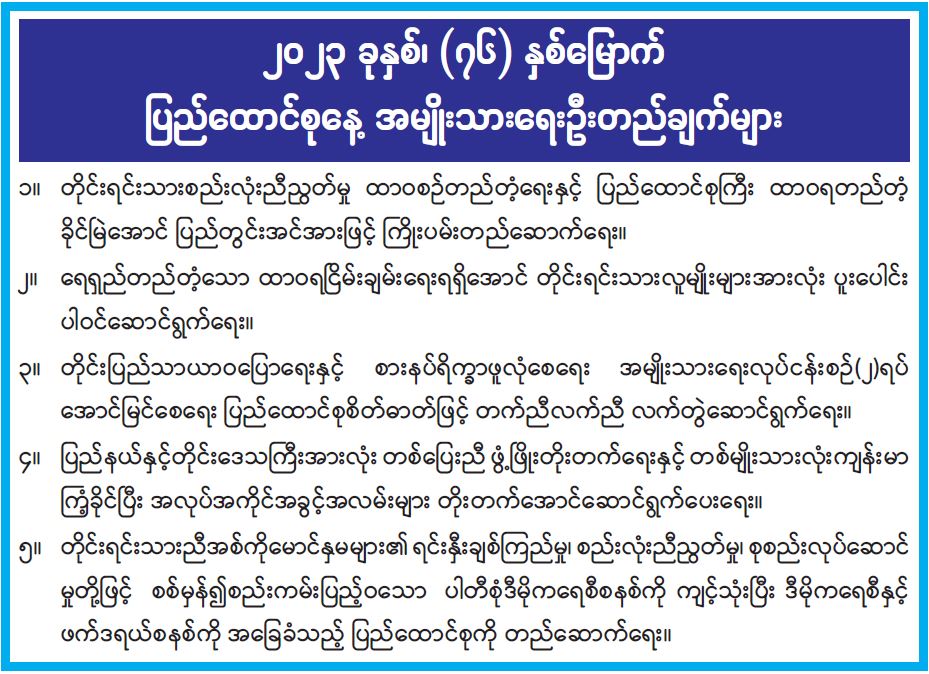 ၂၀၂၃ ခုနှစ်၊ (၇၆) နှစ်မြောက် ပြည်ထောင်စုနေ့ အမျိုးသားရေးဦးတည်ချက်များ