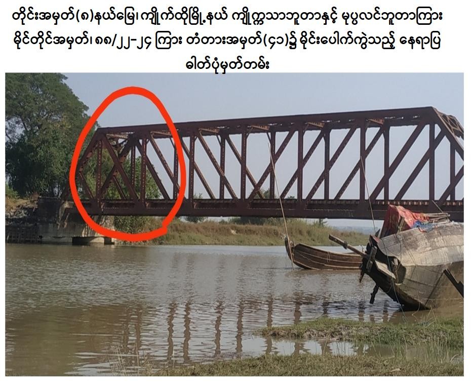 ပဲခူး - မော်လမြိုင်လမ်းပိုင်းရှိ မွန်ပြည်နယ်၊ မုပ္ပလင်ဘူတာနှင့် ကျိုက္ကသာဘူတာအကြား မိုင်တိုင်အမှတ်၊ ၈၈/၂၂-၂၄ ရှိ တံတားအမှတ် (၄၁)အားဇန်နဝါရီ ၂၆ ရက် နံနက် ၄ နာရီခန့်တွင် အကြမ်းဖက်သမားများက မိုင်းထောင်ဖောက်ခွဲခဲ့ရာ တံတားပျက်စီးခဲ့ပြီး မပေါက်ကွဲသေးသည့် လက်လုပ်မိုင်း(၁၀)လုံးကိုလည်း တွေ့ရှိရသဖြင့် မုပ္ပလင် - ကျိုက္ကသာ ရထားလမ်းပိုင်းအား နံနက်(၈) နာရီ(၅၀)မိနစ်တွင် ပိတ်ထားခဲ့ရကြောင်း သိရှိရသည်။