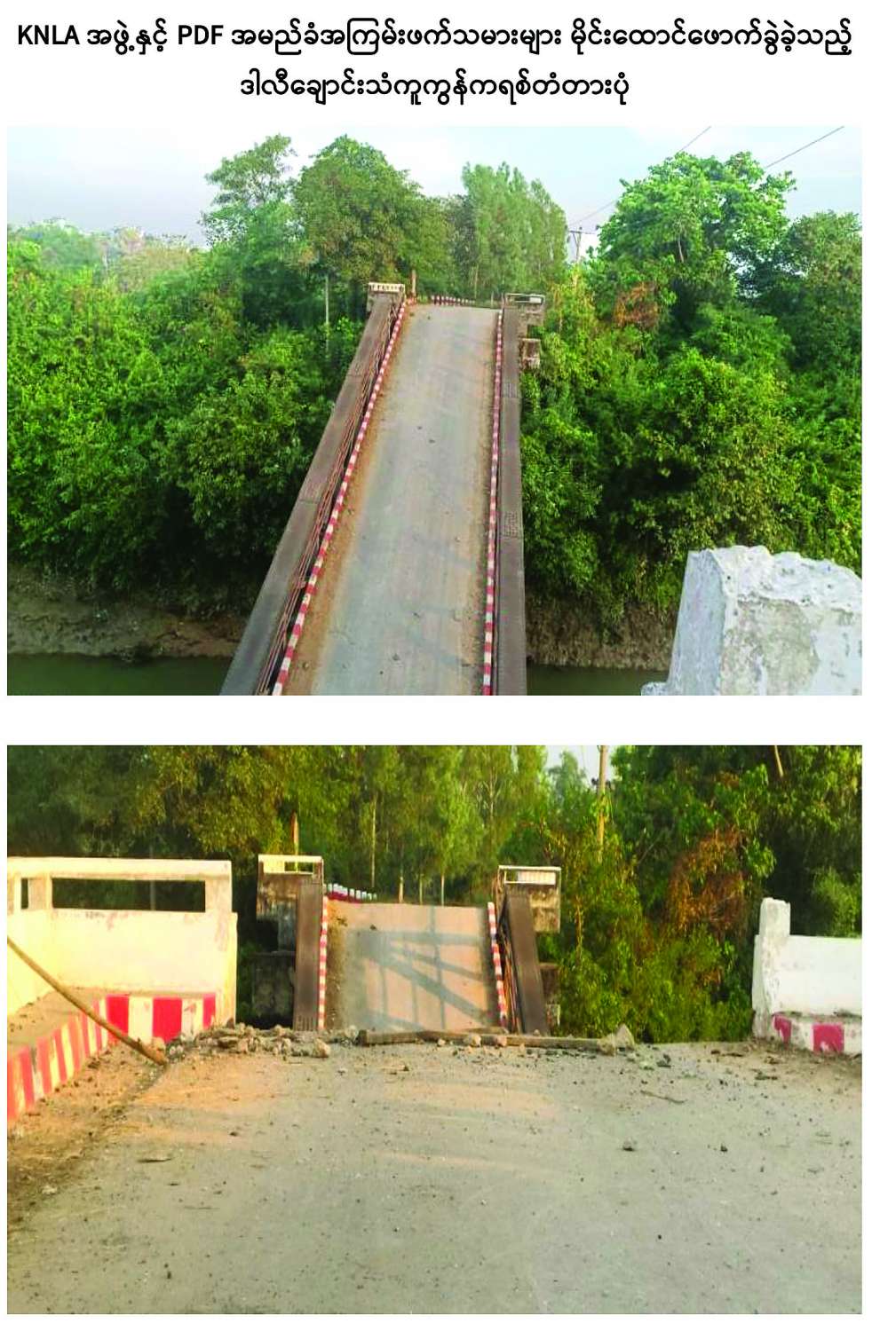 ကရင်ပြည်နယ် ကြာအင်းဆိပ်ကြီးမြို့နယ် ကြာအင်းဆိပ်ကြီး - မော်လမြိုင်သွား ကားလမ်းပေါ် အရှည်ပေ ၁၈၀၊ အကျယ် ၁၄ ပေရှိ ဒါလီချောင်းသံကူကွန်ကရစ်တံတားအား KNLA အဖွဲ့နှင့် PDF အမည်ခံအကြမ်းဖက်သမားများက ယနေ့နံနက် ၇ နာရီခွဲခန့်တွင် မိုင်းထောင်ဖောက်ခွဲဖျက်ဆီးခဲ့သည်။