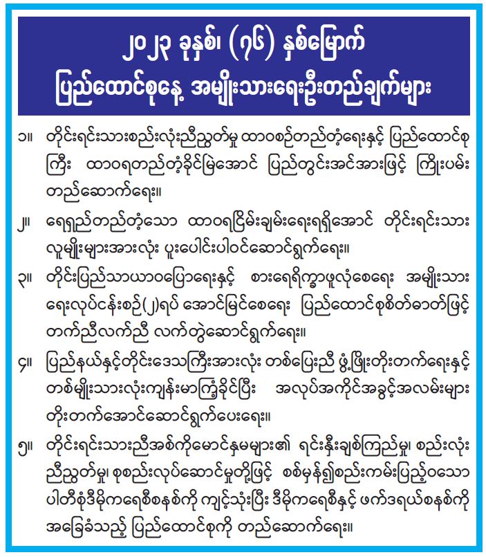 ၂၀၂၃ ခုနှစ်၊ (၇၆) နှစ်မြောက် ပြည်ထောင်စုနေ့ အမျိုးသားရေးဦးတည်ချက်များ
